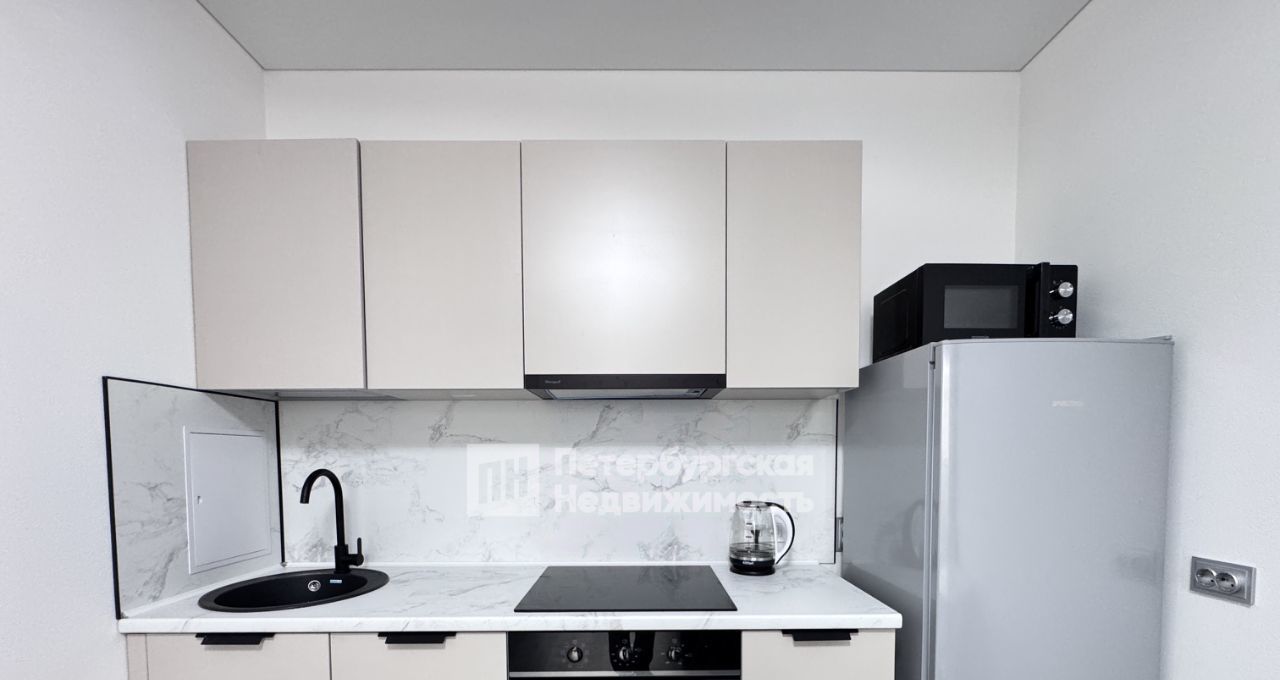 Кухня оснащена всем необходимым: варочная панель, духовой шкаф, вытяжка, холодильник, микроволновая печь, чайник.