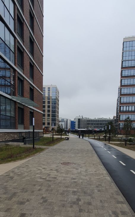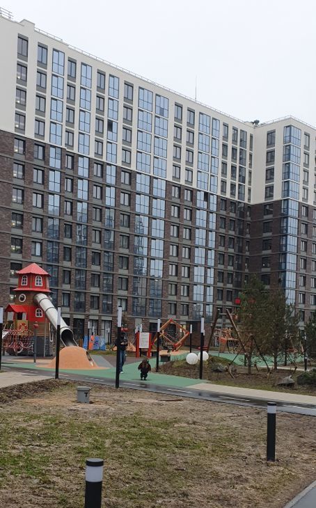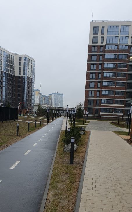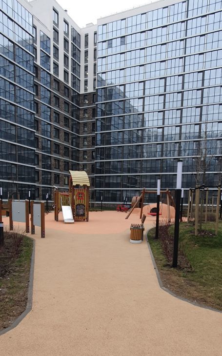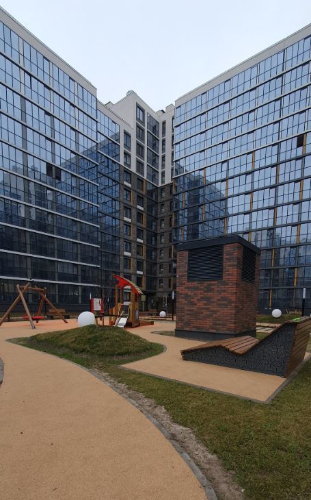 Закрытая уютная территория дома с ландшафтным садом, оснащена прогулочными дорожками, установлены скамейки для отдыха, детскими площадками и спортивным инвентарем.
