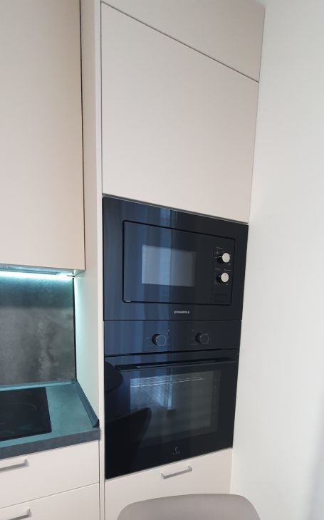 Современная стильная кухня со встроенной варочной панелью, вытяжкой, большим холодильником, духовкой, свч печью и посудомоечной машиной, всей необходимой посудой для приготовления и приёма пищи.