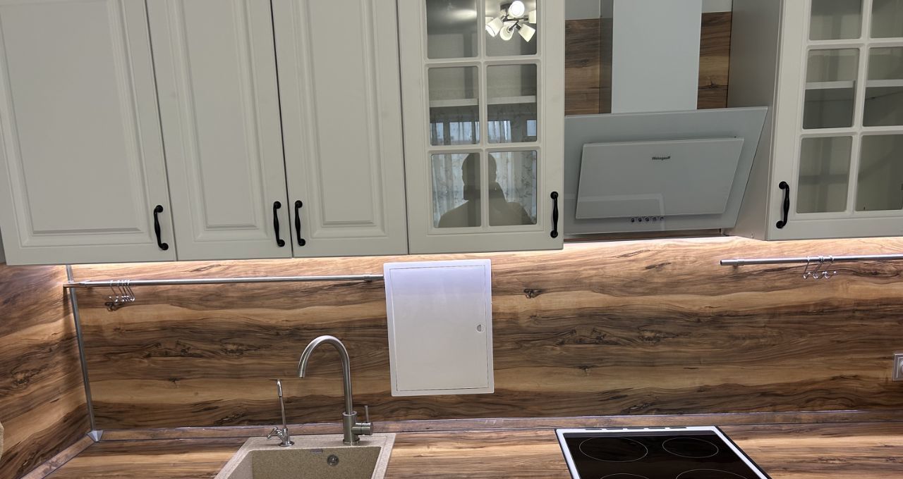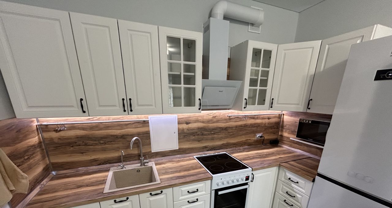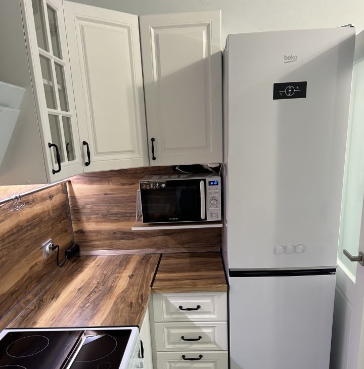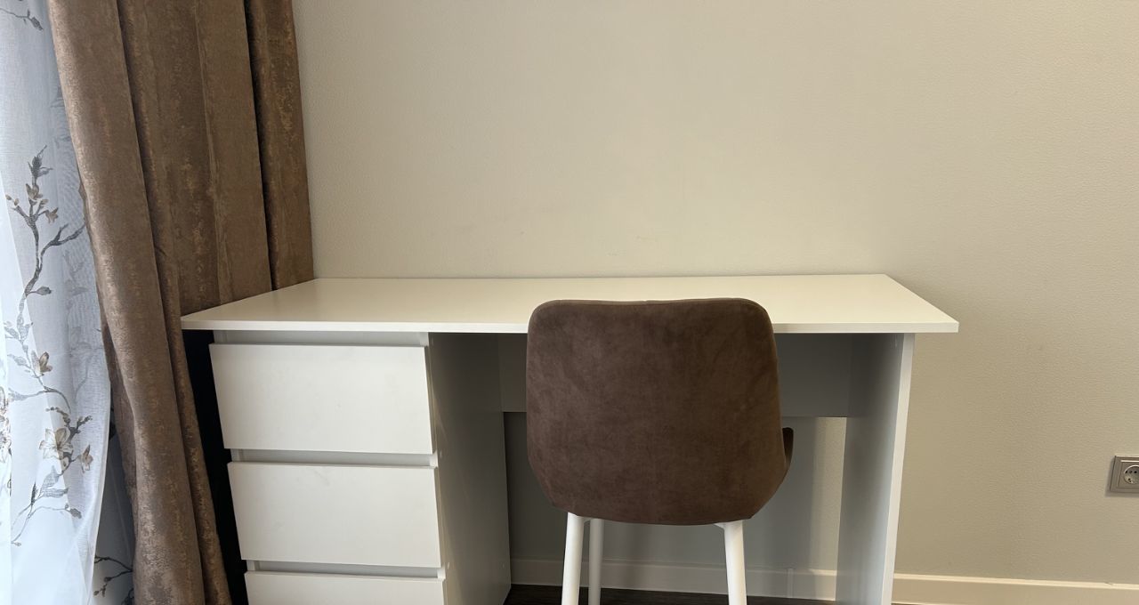 - В кухне-гостиной. Большой и очень удобный и вместительный кухонный гарнитур и качественная новая техника. Диван надежный, удобный, раскладывается в большое спальное место, стол икеа обеденный и стол рабочий/компьютерный, удобные стулья.