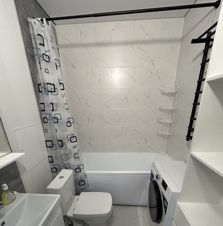 - В ванной стиральная машина, полотенцесушитель, стеллаж и тд