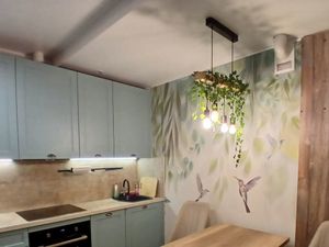 Требуется косметический ремонт: есть царапины на ламинате в комнате и следы от детских рисунков на обоях.