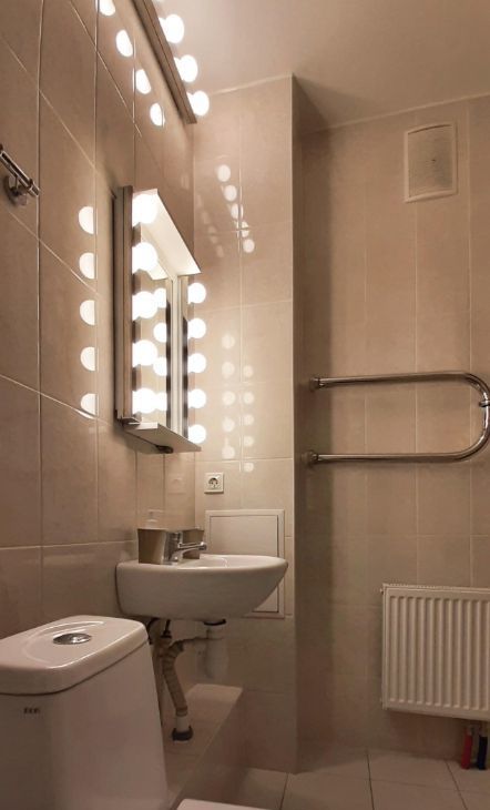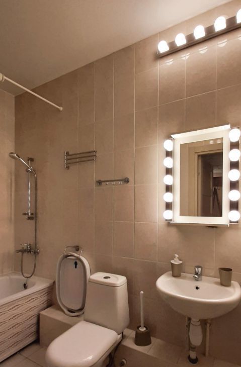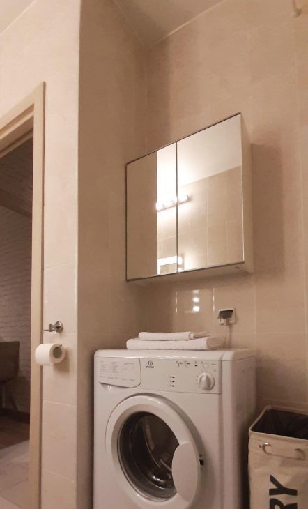 В большом совмещённом санузле имеется ванна, раковина, новая стиральная машина.