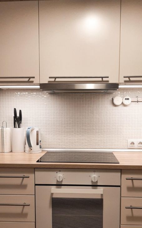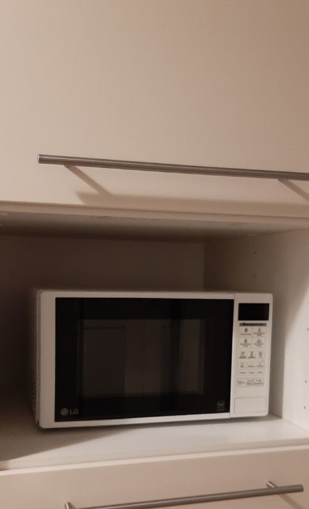 В кухне - духовой эл.шкаф, эл.варочная поверхность, воздухоочиститель, СВЧ печь, большой холодильник, обеденный стол.