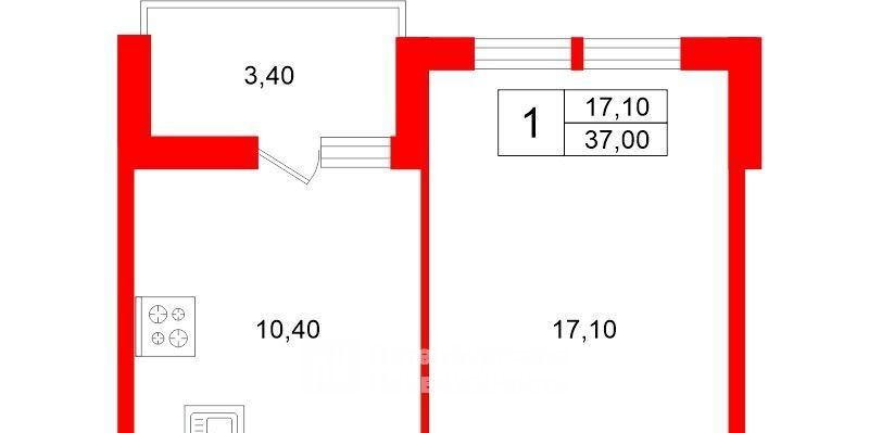 Площадь 37 м2 + остекленная лоджия, комната 17.1 м2, кухня, 10.4 м2