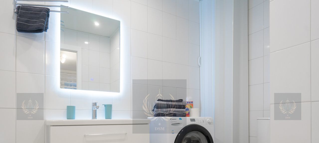 Дизайн: Свежий ремонт в светлых тонах, панорамные окна и высокие потолки, наполняющие квартиру светом.