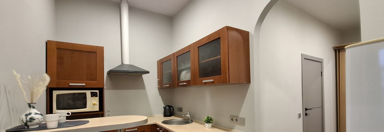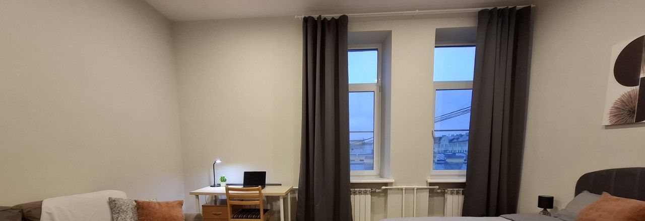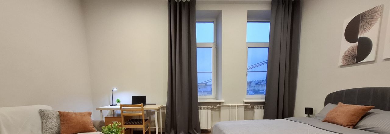 Сдается в аренду уютная однокомнатная квартира в историческом центре города, по адресу Россия, Санкт-Петербург, 4-я Советская улица, 42. Общая площадь квартиры составляет 45 кв. м, жилая 17 кв. м, кухня 5 кв. м. Квартира расположена на пятом этаже красивого кирпичного дома 1859 года постройки, который оборудован пассажирским лифтом. Высокие потолки 3,10 метра создают ощущение простора и света.