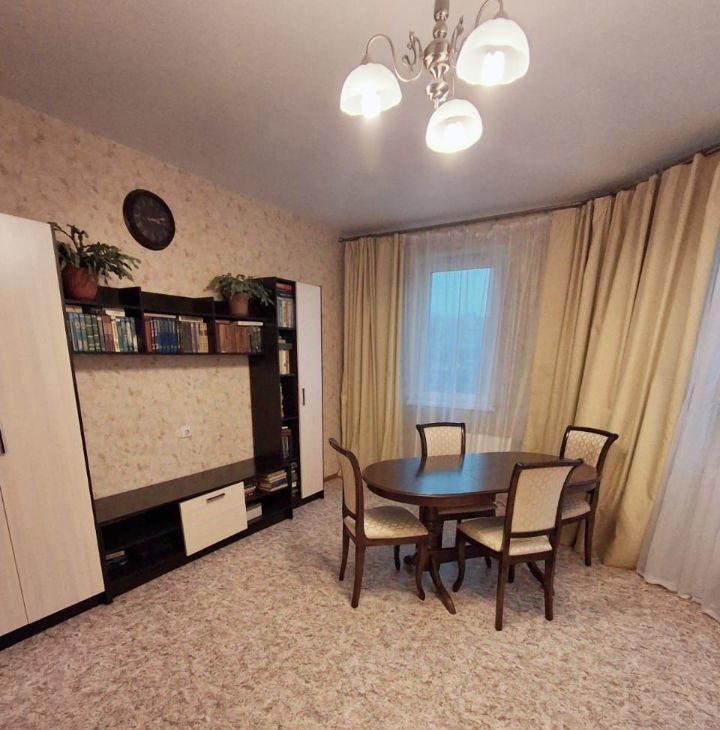 Комната светлая и просторная наполнена необходимой мебелью: удобный диван /раскладывается, обеденный стол со стульями, стенка, шкаф, комод.