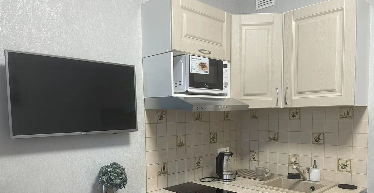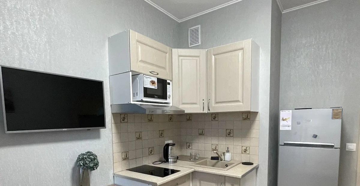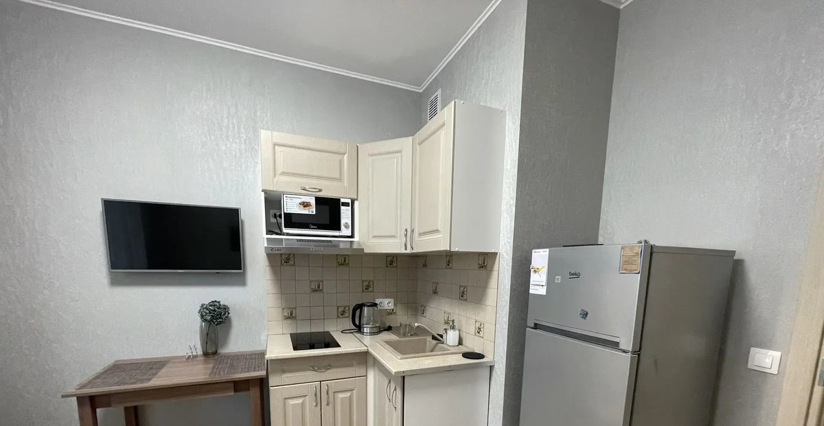 2-кам.холодильник, варочная панель, СВЧ, вытяжка, чайник, стир. машина, стол, стулья, прихожая, комод. Есть свободное место для дополнит. оснащения.