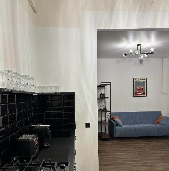 Небольшая кухня оборудованная техникой и посудой для сервировки.