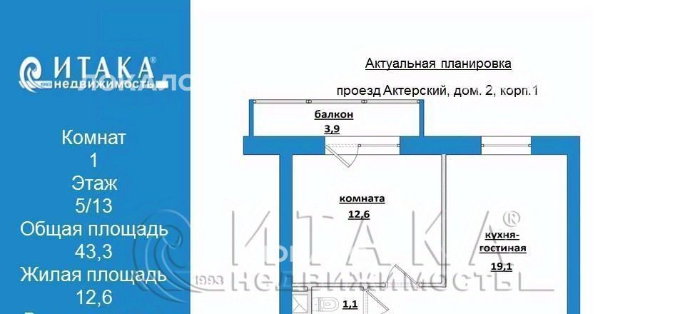 1-комнатная квартира: Санкт-Петербург, Актёрский проезд, 2к1 (43.3 м²)