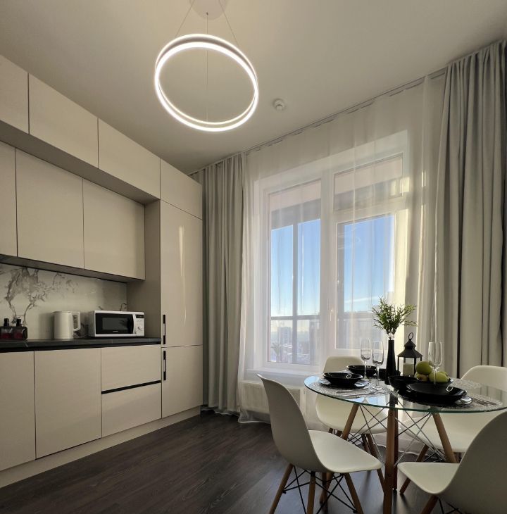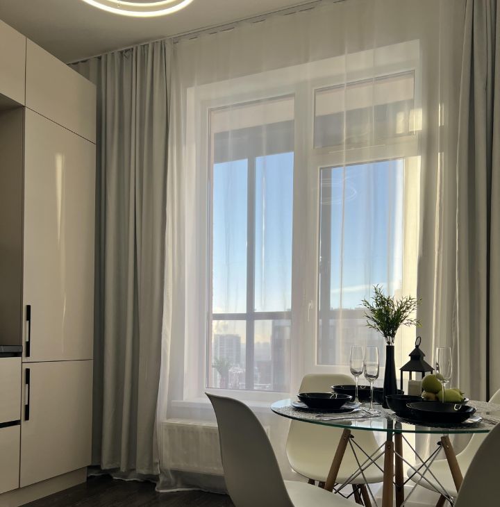 Продается светлая квартира на 24 этаже монолитно-кирпичного дома, построенного в 2022 году. Просторная комната с высокими потолками 3 метра и большими окнами, выходящими во двор, наполняет пространство естественным светом. В квартире выполнен качественный ремонт с использованием современных материалов и теплых оттенков.
