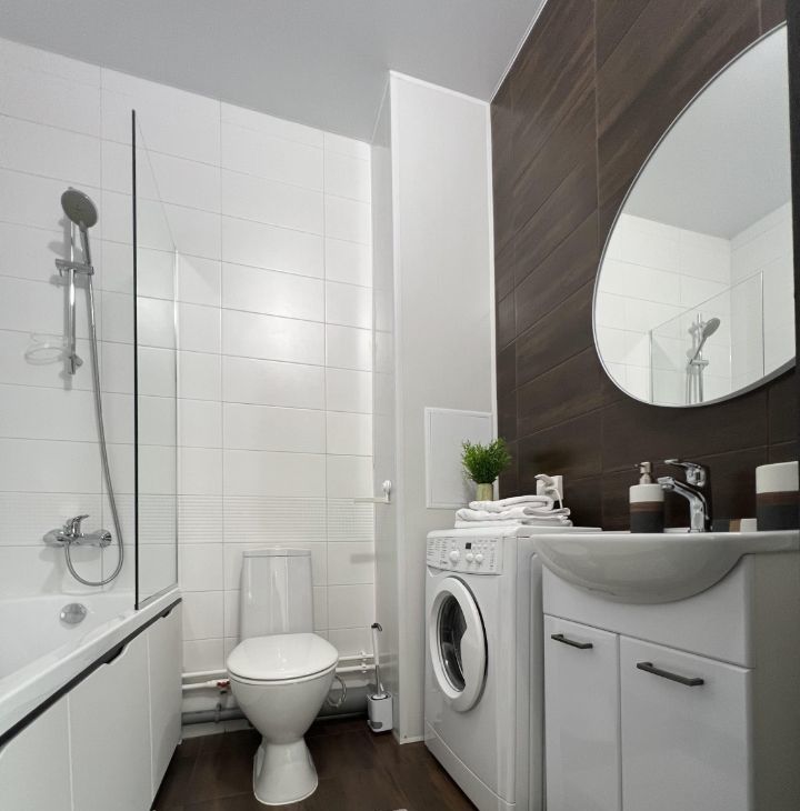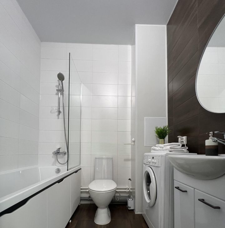 Кухня оборудована встроенной техникой, включая холодильник и посудомоечную машину. Обеденная зона оформлена стильным стеклянным столом и современными стульями. Ванная комната совмещенная, оснащена ванной и стиральной машиной.