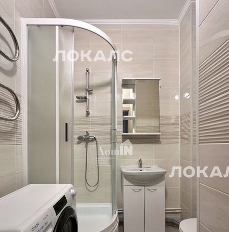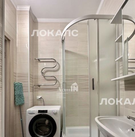 - Совмещенный санузел с душем, шкафчиком с зеркалом и стиральной машиной;