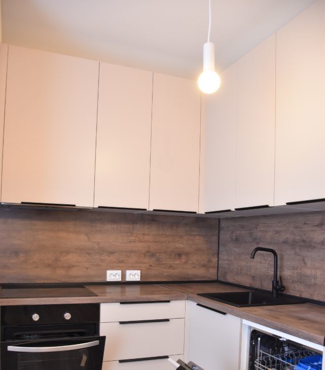 -кухонный гарнитур, холодильник, микроволновая печь, посудомоечная машина, обеденный стол, стулья,