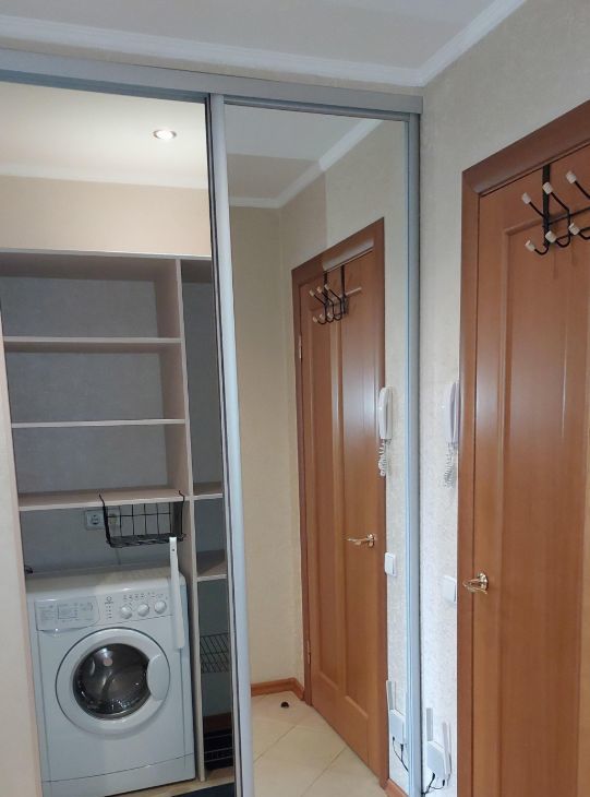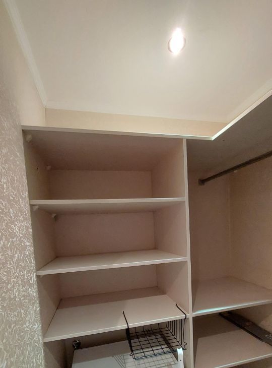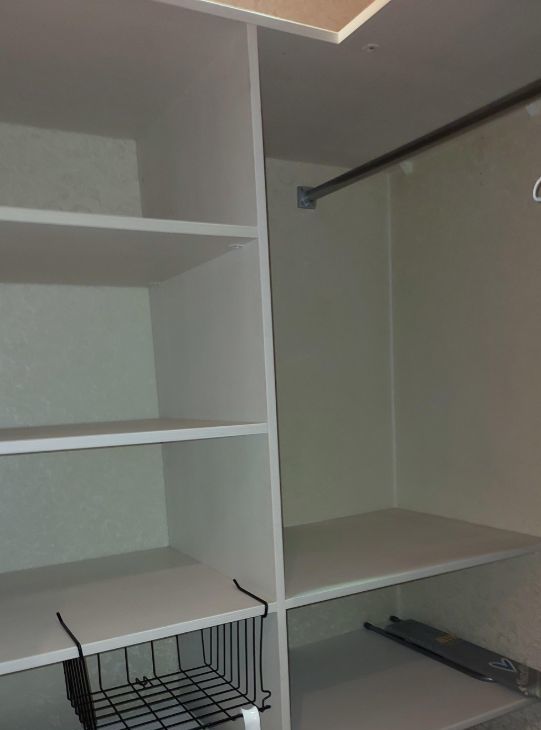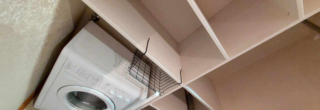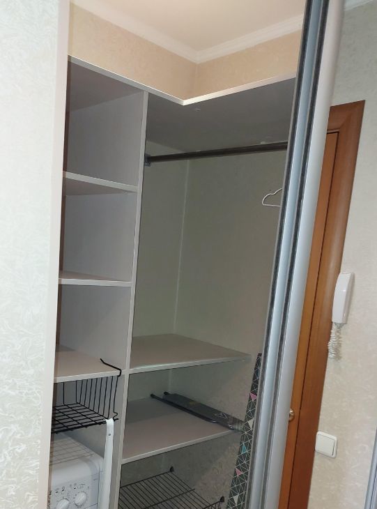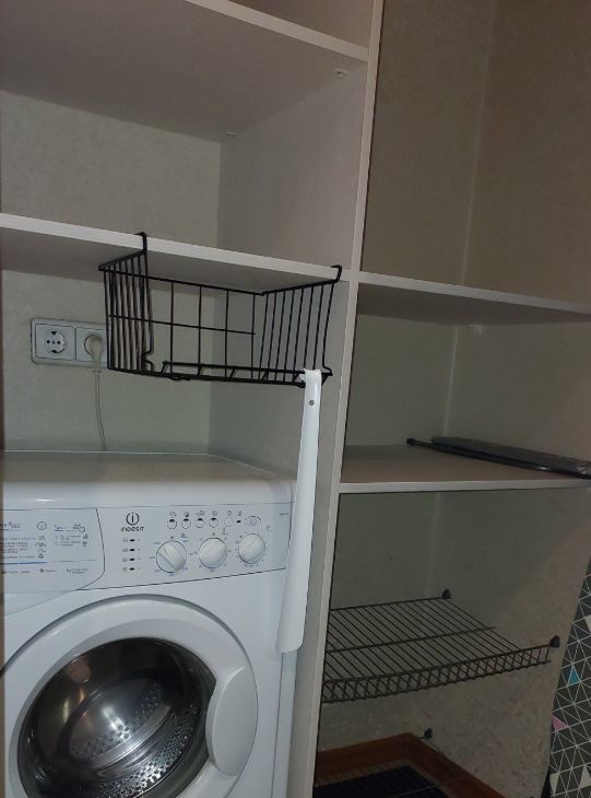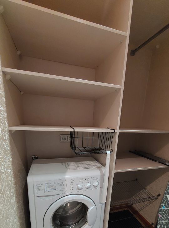 Гардеробная: полки, шкаф для одежды, стиральная машина, сушилка для белья, гладильная доска, фен, утюг.