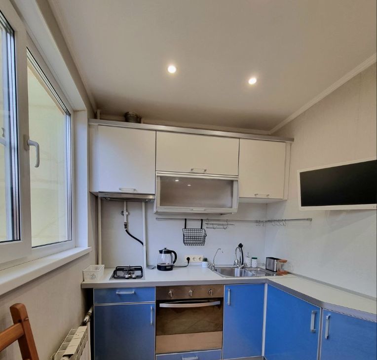 Кухня: кухонный гарнитур, стол, стулья, телевизор, чайник.