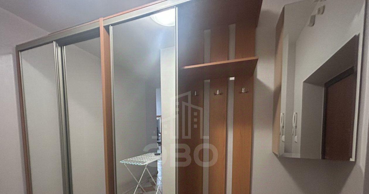 Просторная прихожая с удобной системой хранения: шкаф-купе с зеркальным фасадом, открытая вешалка для сезонной одежды и функциональный шкаф для обуви.