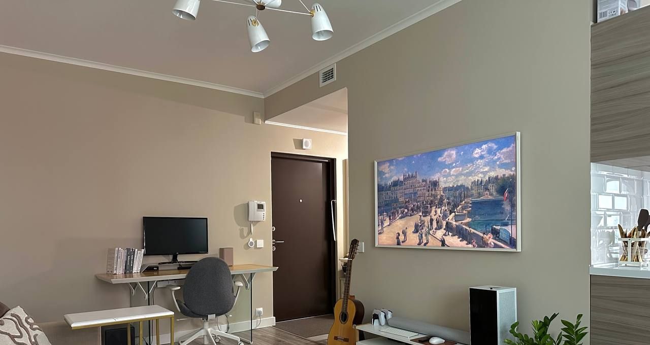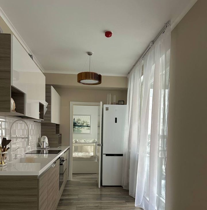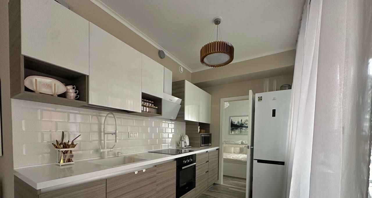 В квартире выполнен современный ремонт из качественных материалов, на кухне установлена столешница из искусственного камня, посудомойка, в гостиной телевизор-картина со скрытыми проводами, в ванной есть сушильная машина.