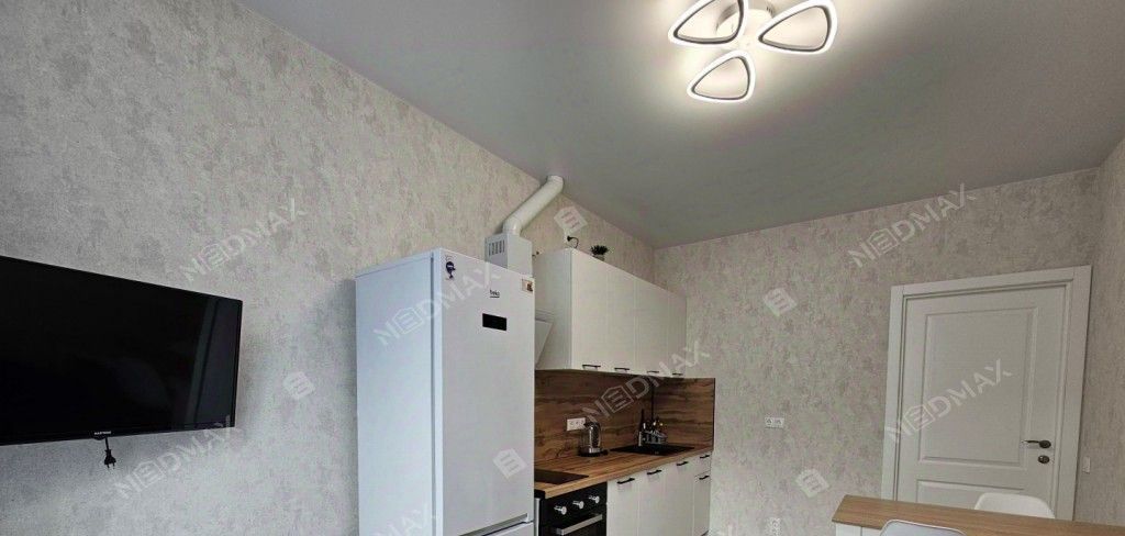 Полностью оборудованная кухня со всей необходимой техникой: варочная панель, духовой шкаф, вытяжка, холодильник, телевизор, микроволновка.