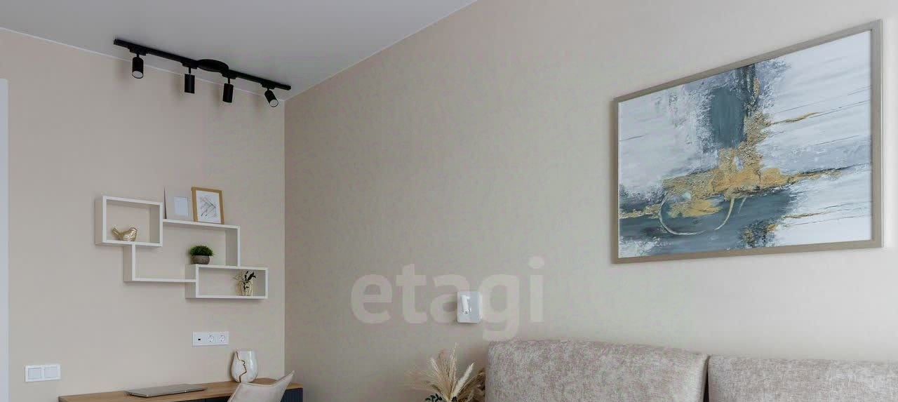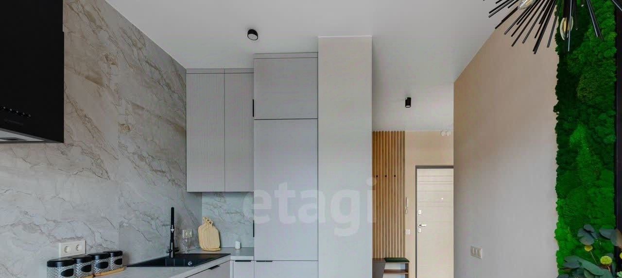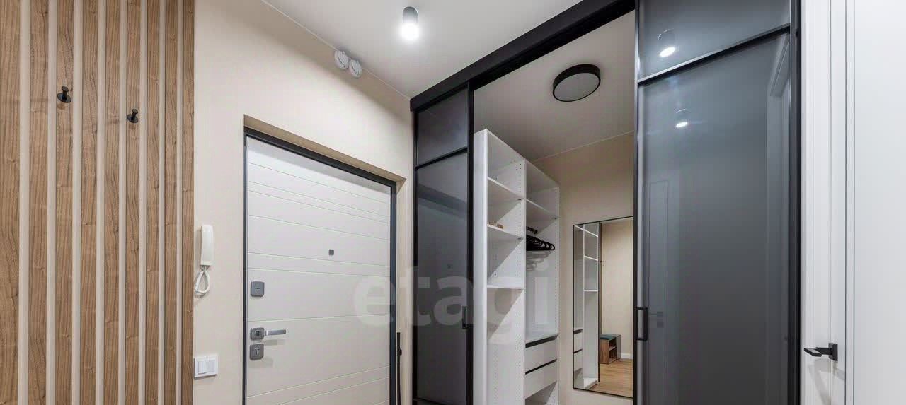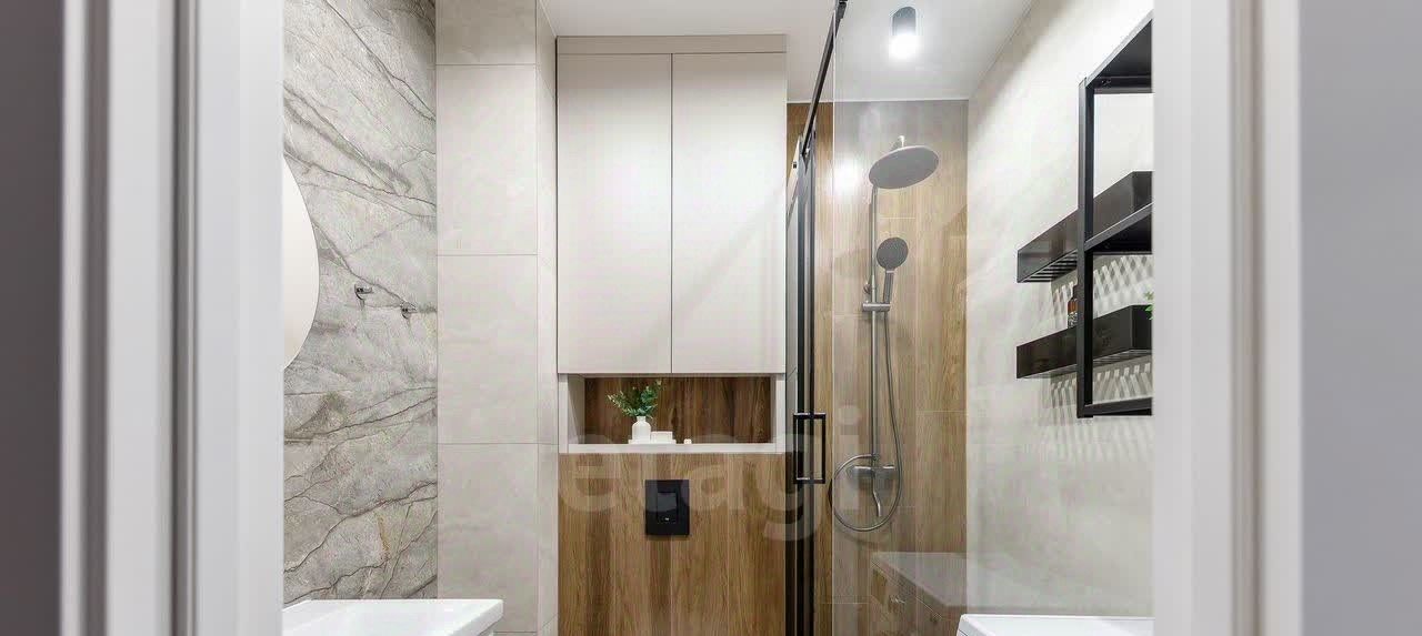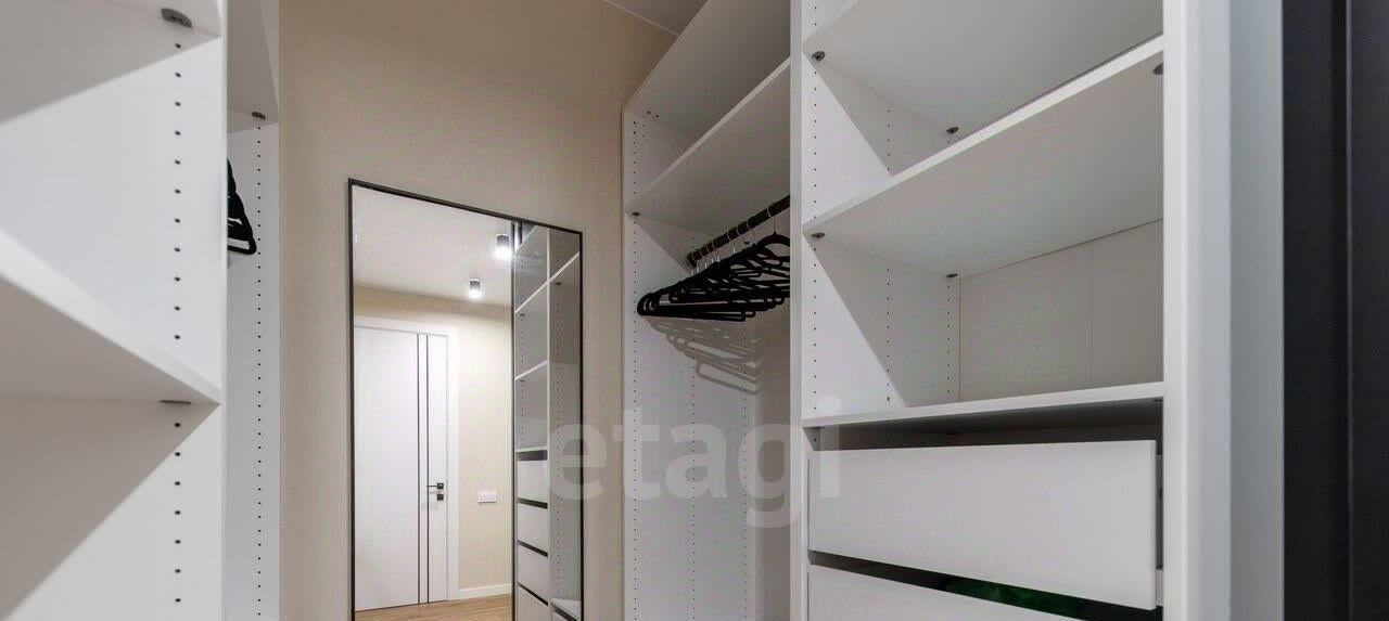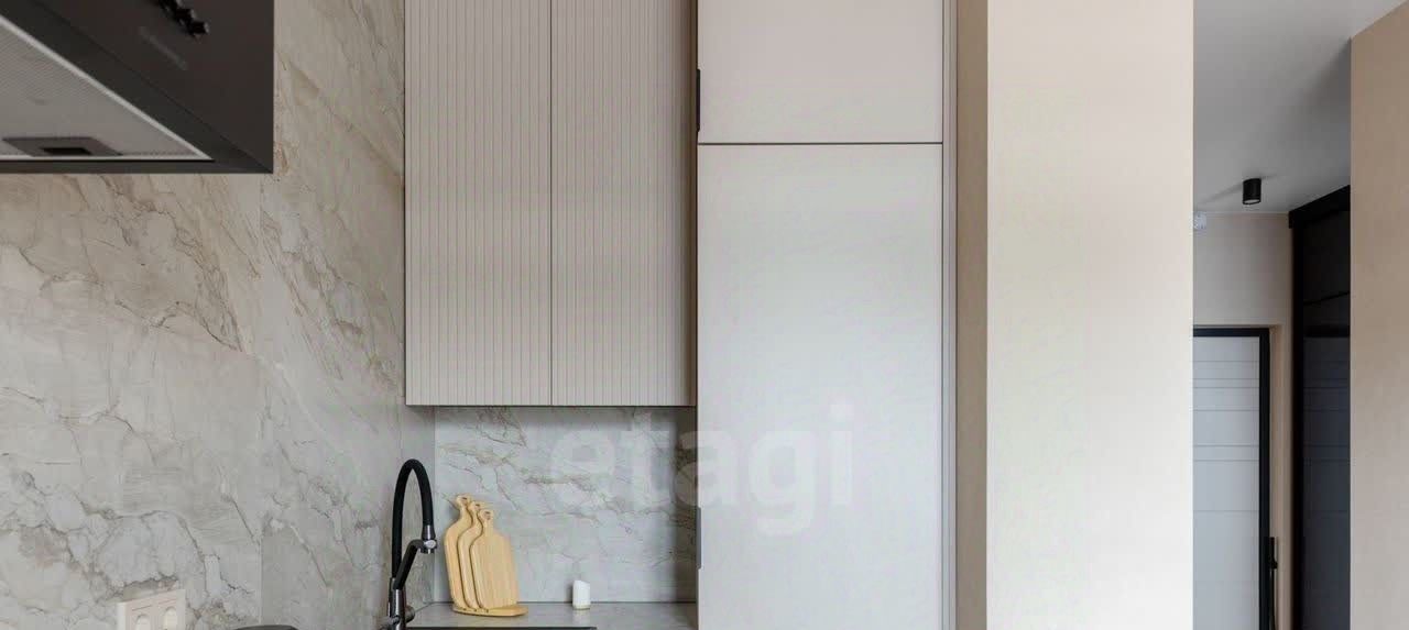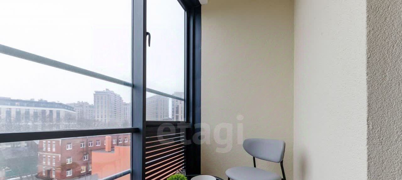 Просторная кухня, застеклённая лоджия, изолированная спальня, гардеробная и совмещённая ванная комната.
