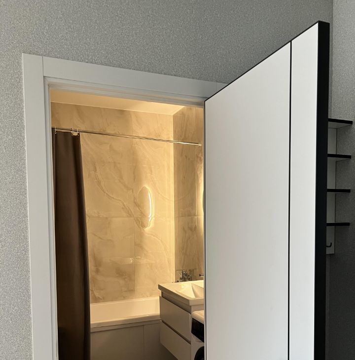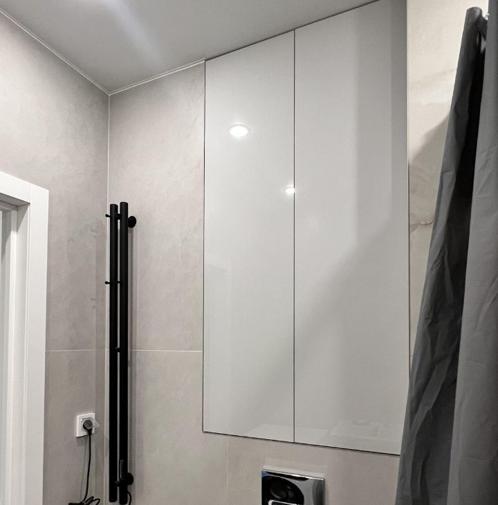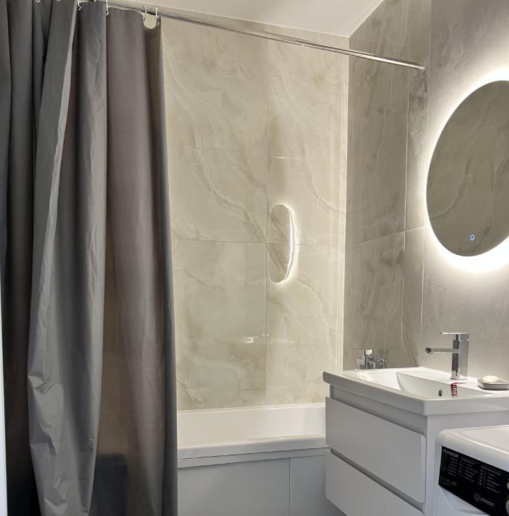 Санузел: стиральная машина, электрический полотенцесушитель, зеркало с подсветкой, зона хранения. В зоне тумбы под раковиной расположены изолированные розетки для техники, например, фена. Все провода спрятаны от глаз.