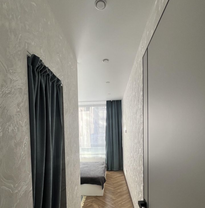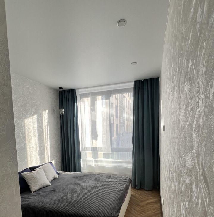Спальня: двуспальная кровать с ортопедическим матрасом, отдельная гардеробная. Освещение: основной свет + 2 доп. (над кроватью и карнизная подсветка).