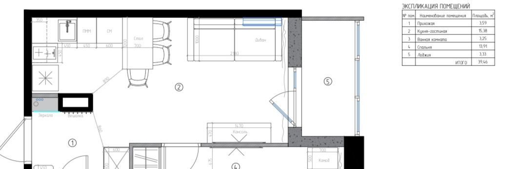 Планировка - кухня-гостиная (15,4 м2), спальня (13,9 м2), ванная комната (3,2 м2), прихожая (3,6 м2) и лоджия (3,4 м2), итого общая площадь квартиры 39,5 м2.