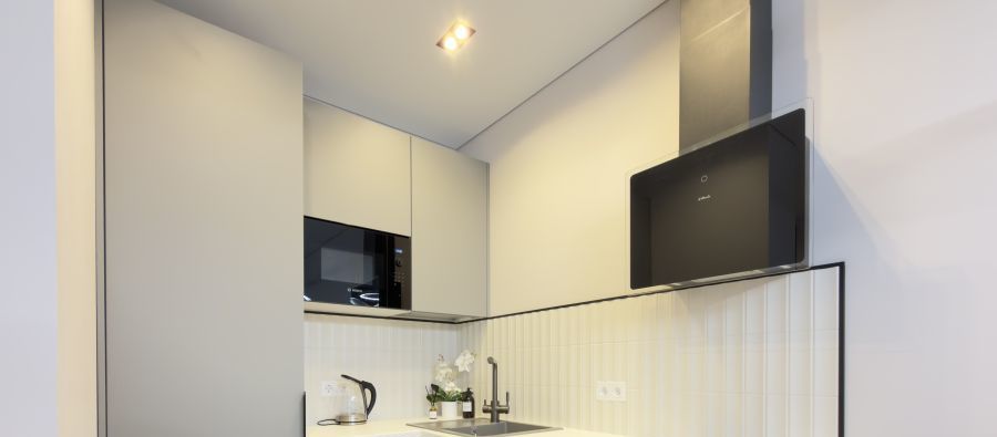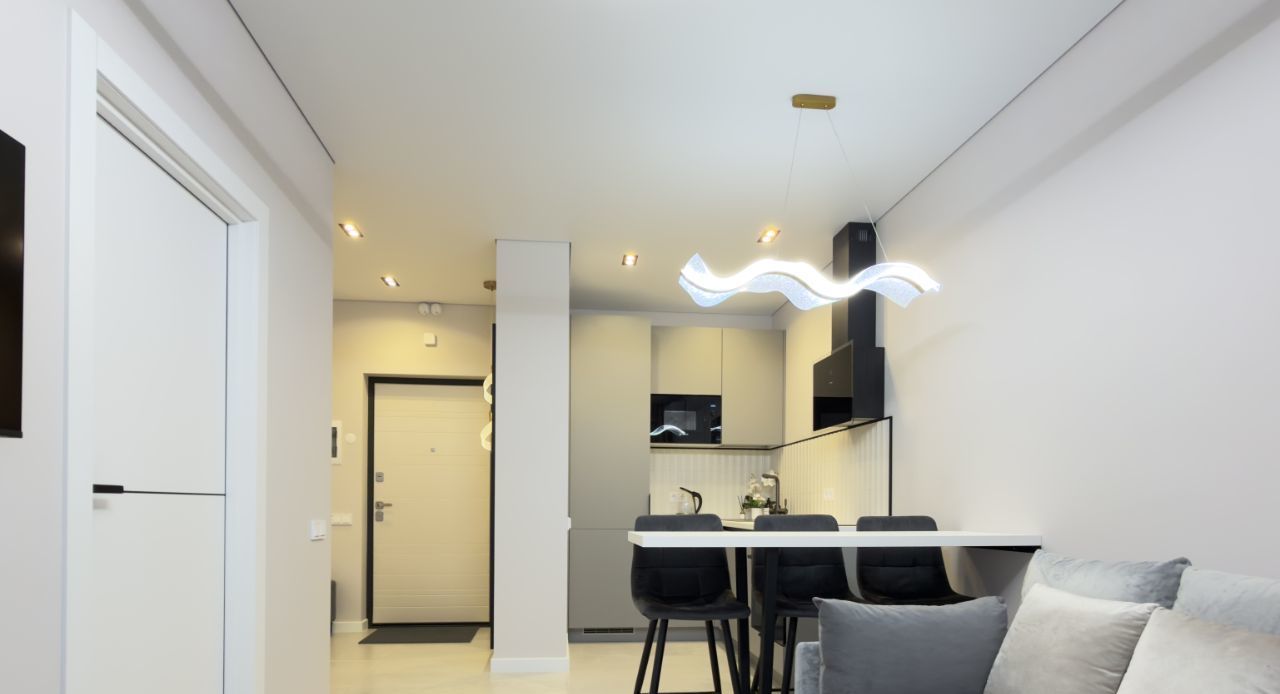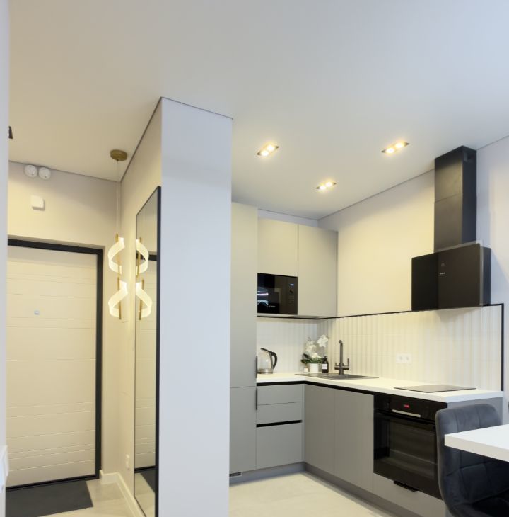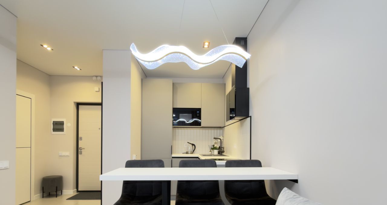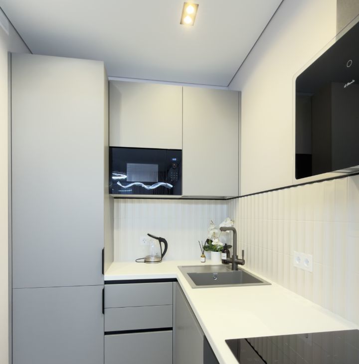 Индукционная плита, микроволновая печь, чайник, посудомоечная машина, встроенный холодильник, духовой шкаф, вытяжка.
