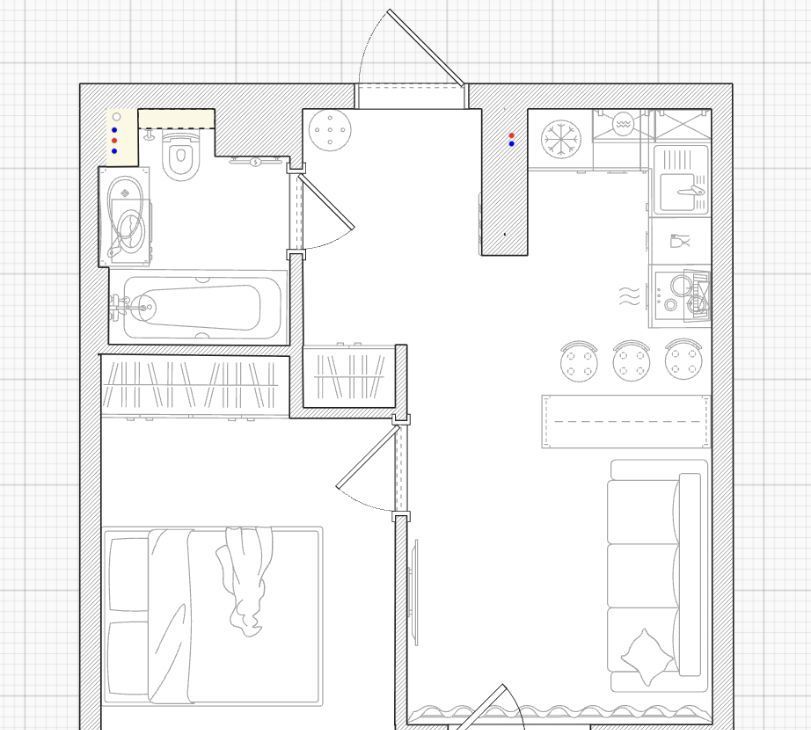 • Места для хранения вещей - шкаф в прихожей и еще большой шкаф в спальне. • Кухонный гарнитур и обеденная зона.