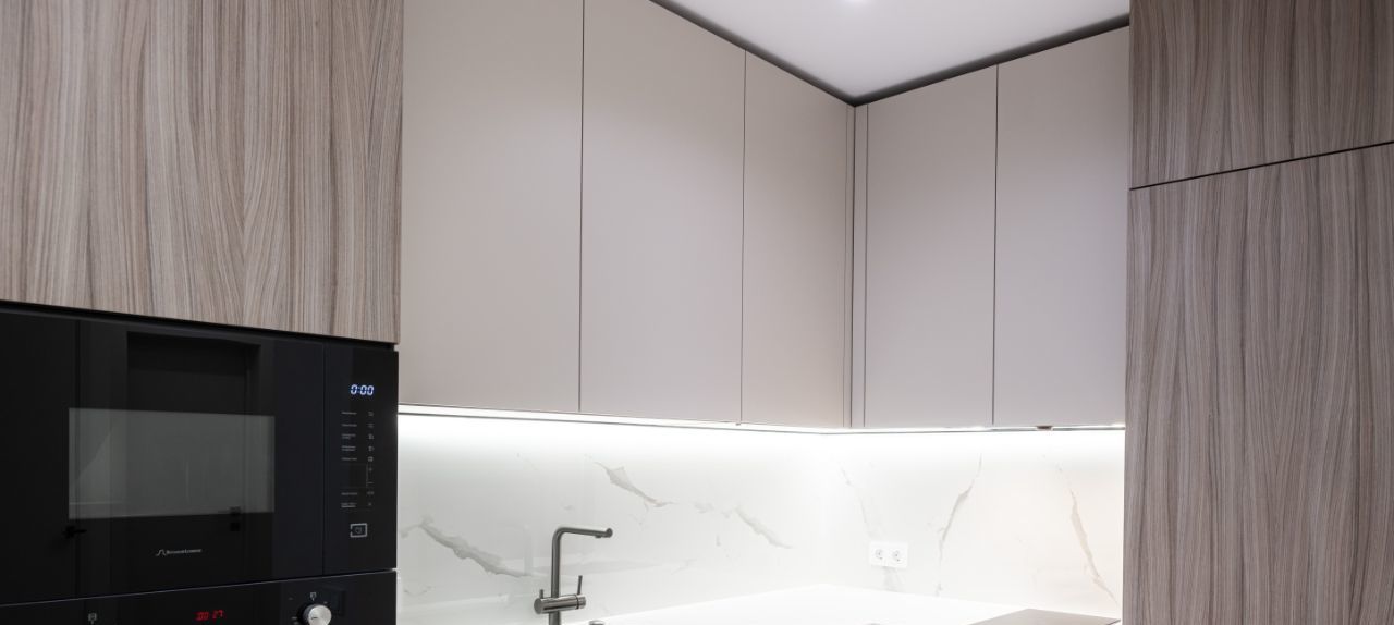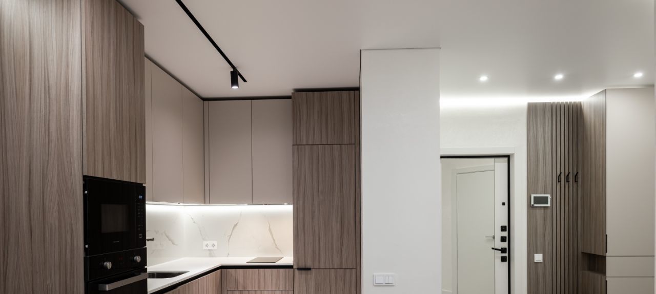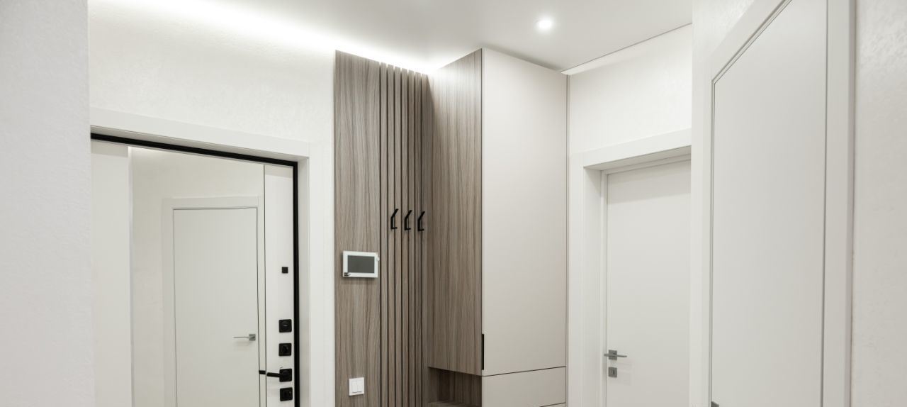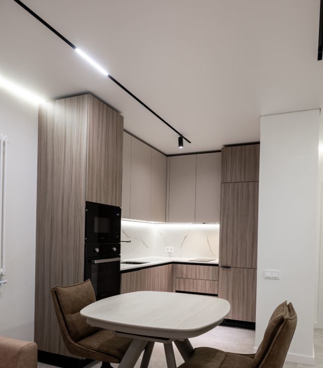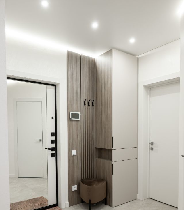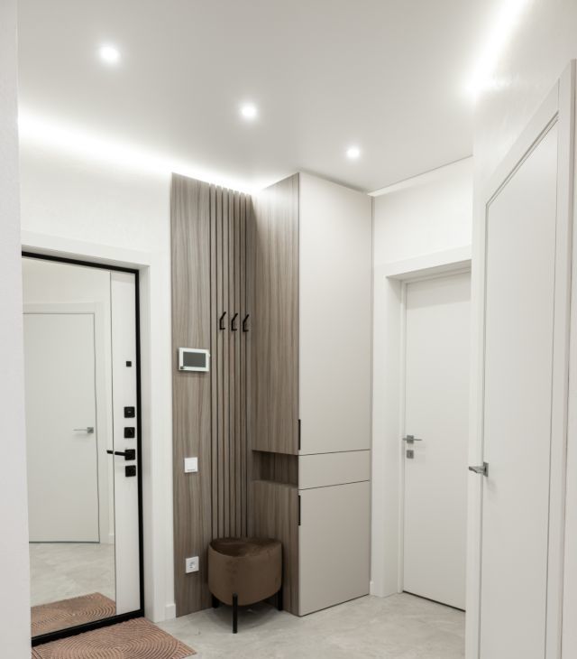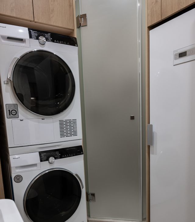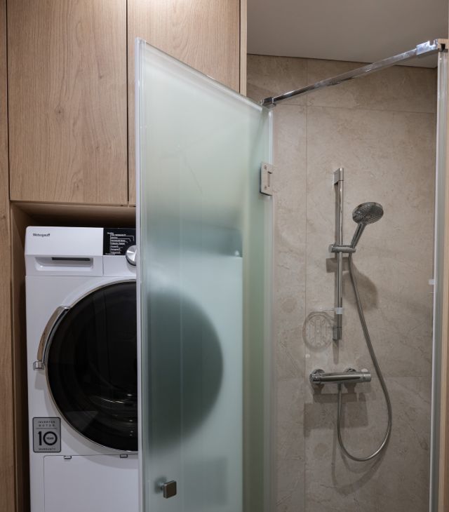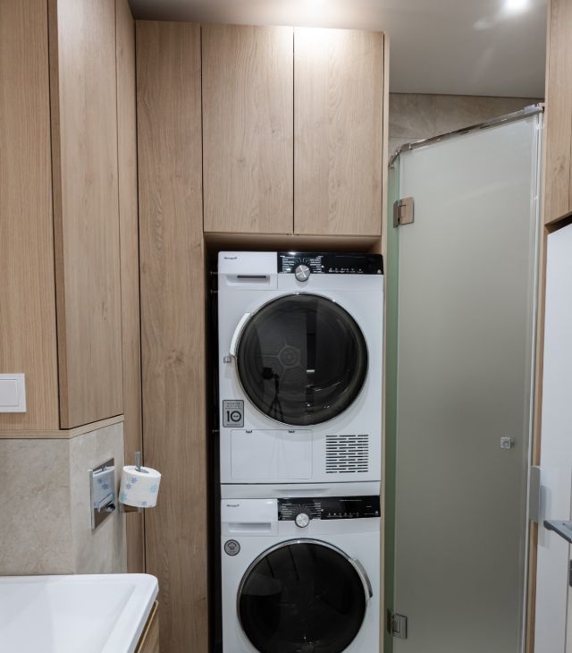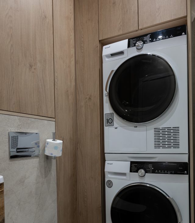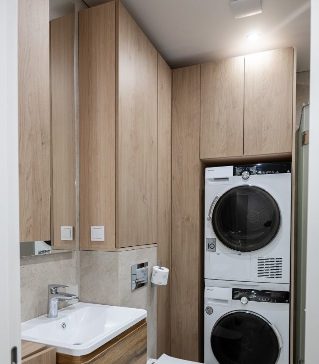 Умная организация: Кухня-гостиная с индивидуальным гарнитуром, обеденной зоной и раскладным диваном. В прихожей — гардеробная и место для хранения. В санузле — полноценная прачечная зона со стиральной, сушильной машинами и сушильным шкафом.