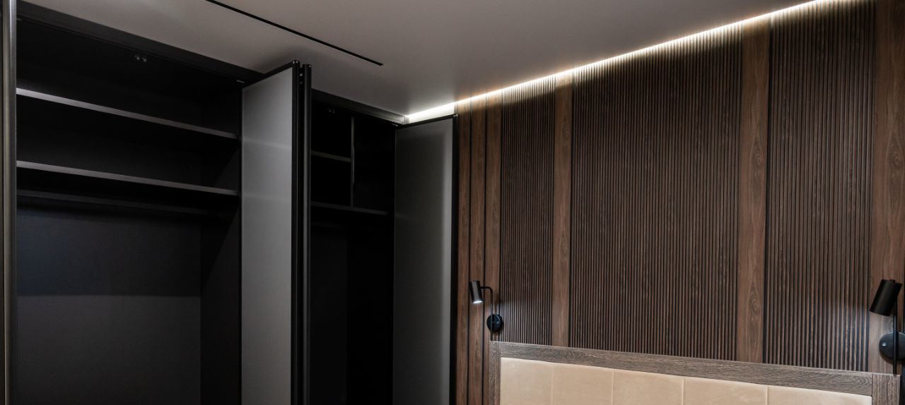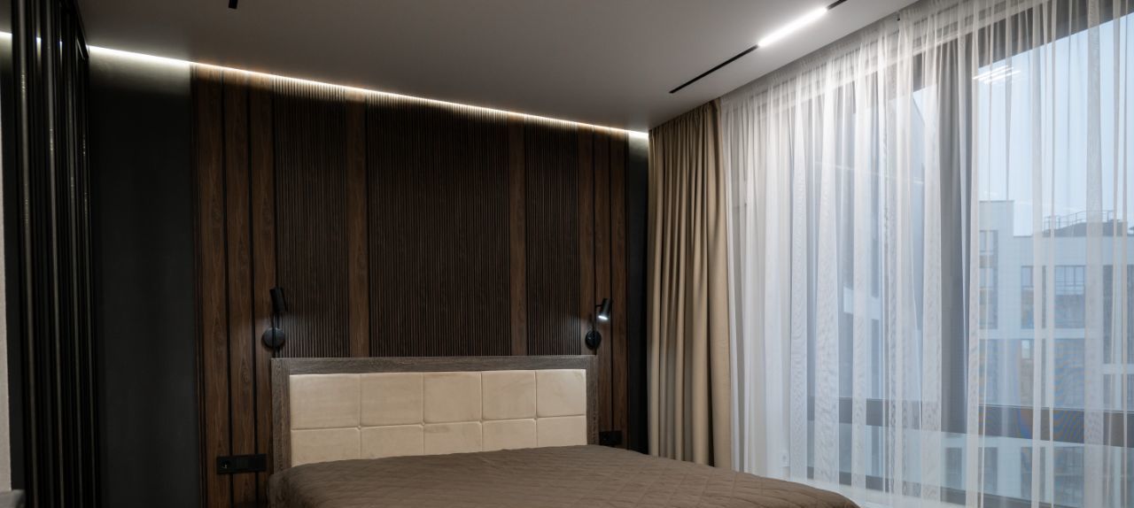 Простор и свет: Панорамные окна наполняют пространство светом. Просторная спальня с кроватью премиум-класса (Askona) и большим шкафом.