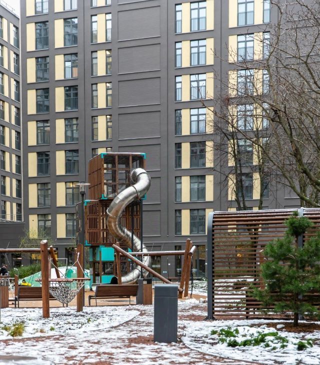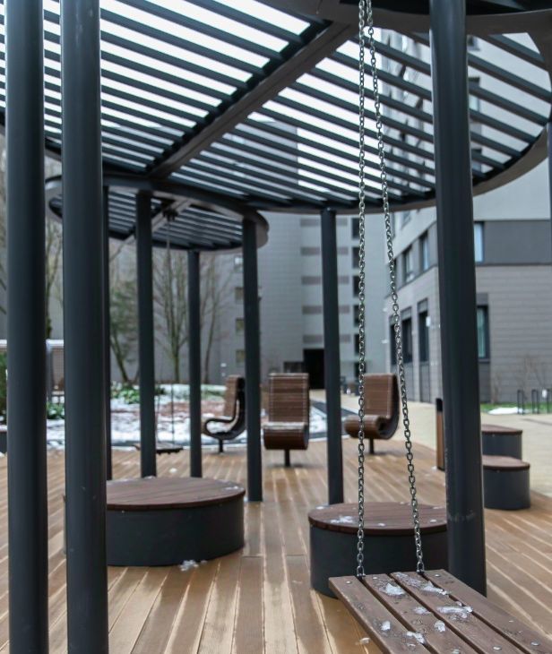 Безопасный и благоустроенный двор: Жилой комплекс с закрытой территорией, свободной от машин. Во дворе есть уютная зона отдыха для взрослых и детей.