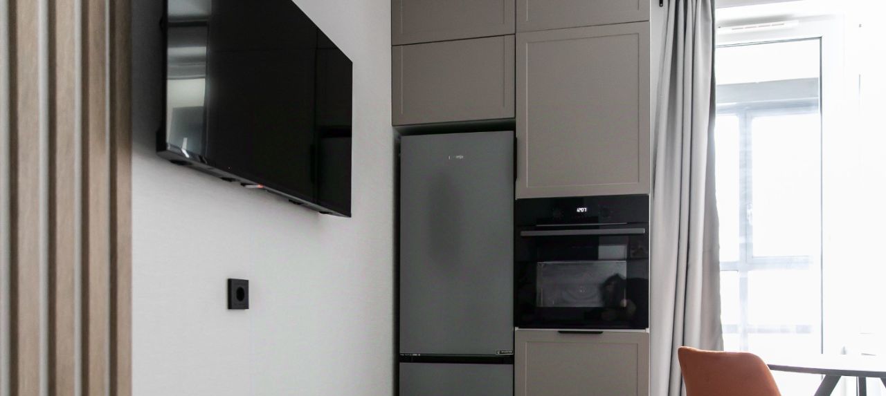 Полная комплектация: Всё для комфортной жизни уже есть — новая бытовая техника (посудомоечная и стиральная машины, духовой шкаф, холодильник, микроволновка, телевизор).