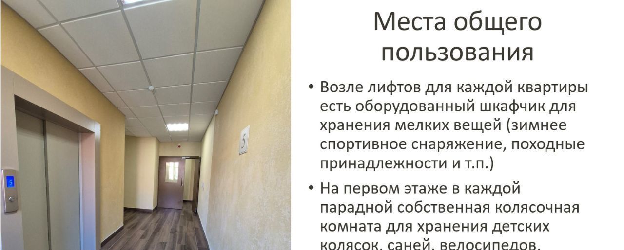 На первом этаже расположена колясочная, где можно хранить велосипеды. На этаже, у лифта, есть личный шкафчик для хранения вещей.