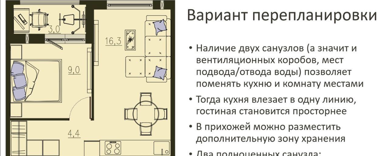 В квартире выполнена предчистовая отделка, как чистый лист бумаги, на котором можно нарисовать все, что угодно. В обеих комнатах установлены приточные клапаны вентиляции. Отопление с горизонтальной разводкой, нет стояков, а на батарее установлены терморегуляторы. Платить за него нужно по счетчику, а значит не будет горячих батарей в мае, за которые нужно отдавать половину стоимости КУ. Два санузла.