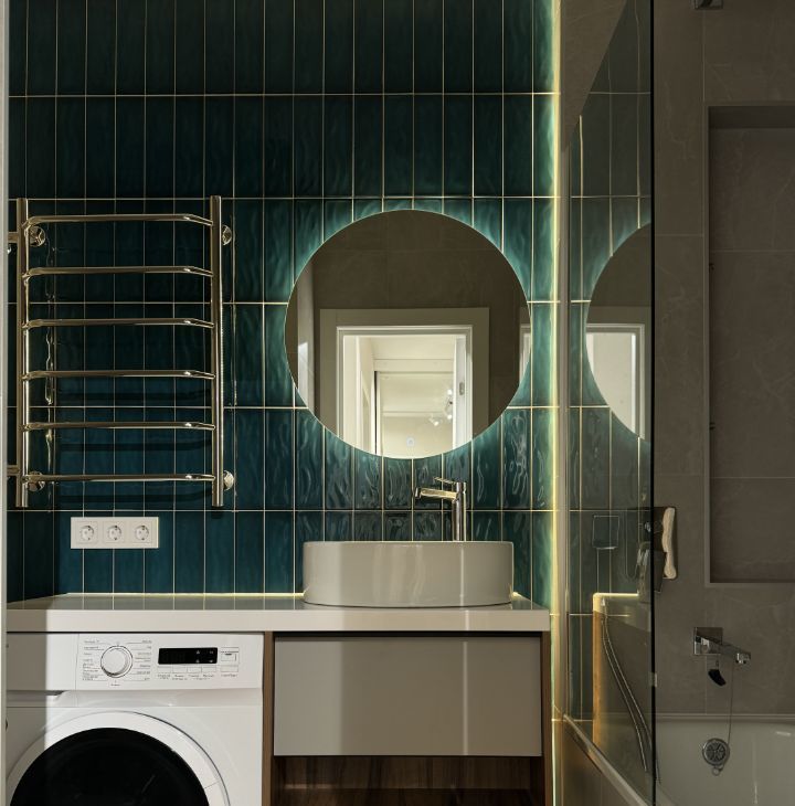 Ванная комната оборудована стиральной машиной, зеркалом с подсветкой.