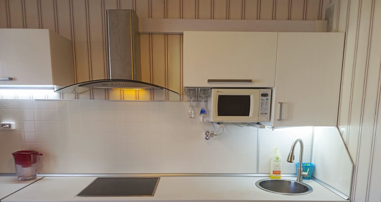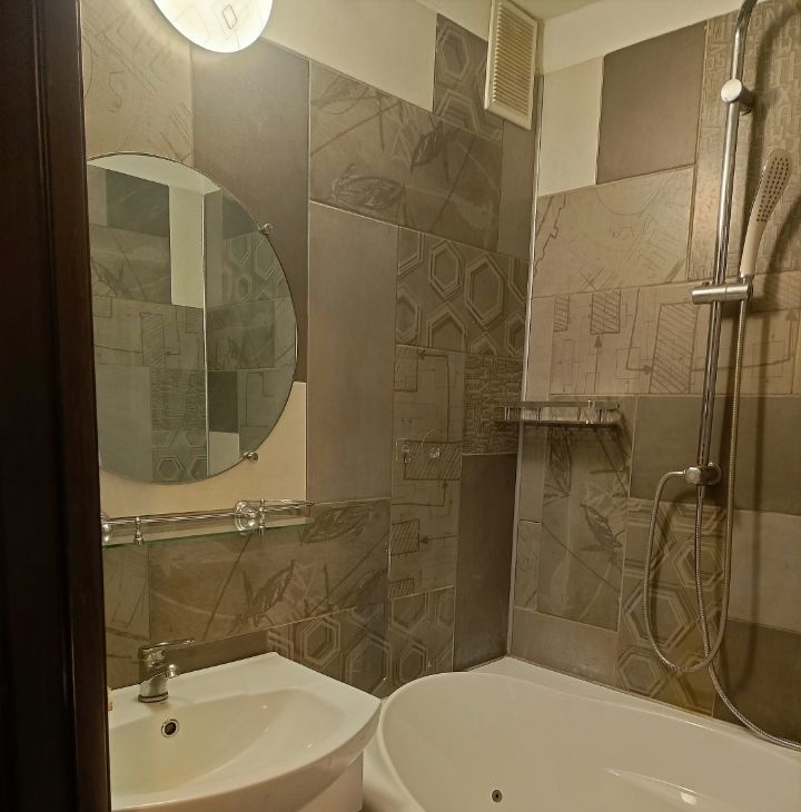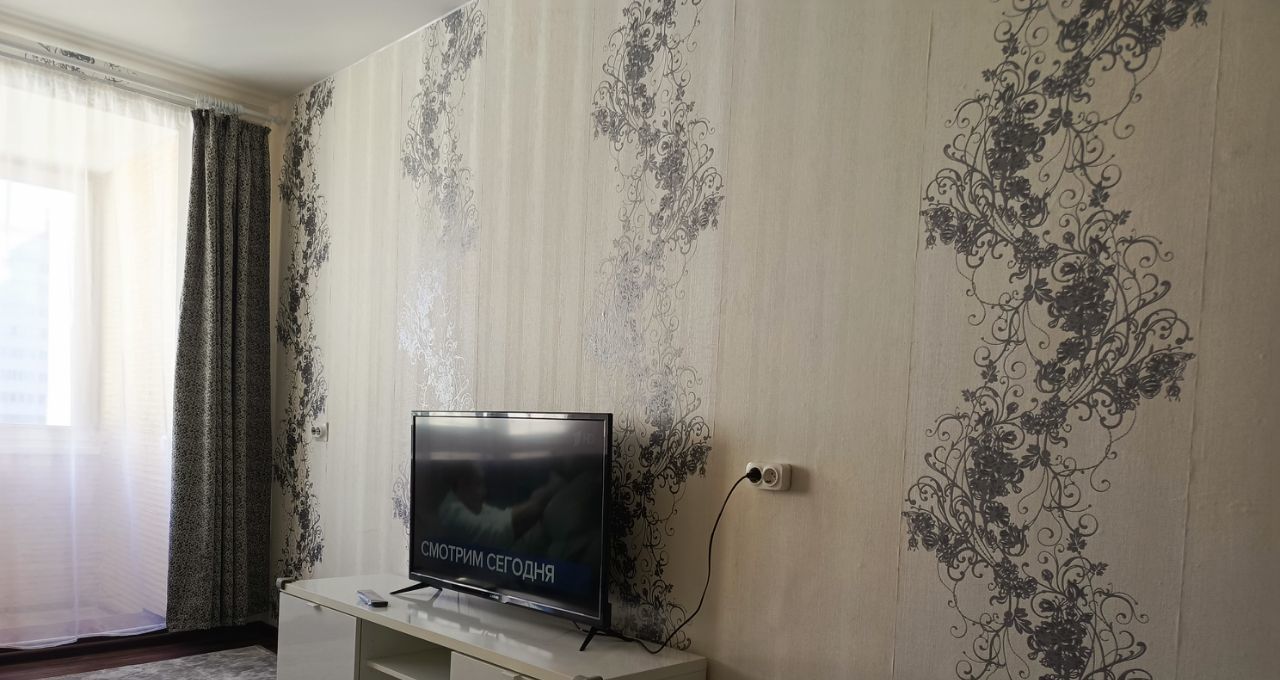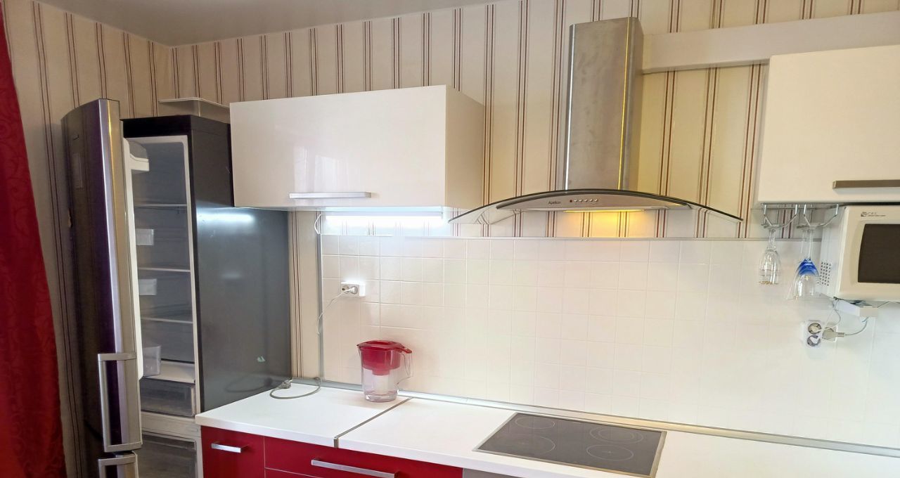 Квартира полностью оборудована для комфортного проживания. Спальня отгорожена от комнаты сдвижными зеркальными дверями, с 2-х спальной кроватью. В комнате телевизор, тумба, диван-кровать. Есть свободное место для установки детской кроватки. Очень удобно для семьи с маленьким ребенком. Лоджия утеплена застеклена и присоединена к комнате. Большая кухня 11м.кв. оборудована всеми бытовыми приборами: холодильник, посудомоечная машина, варочная электропанель, электрический духовой шкаф, микроволновка, вытяжка. Все оборудование класса А.