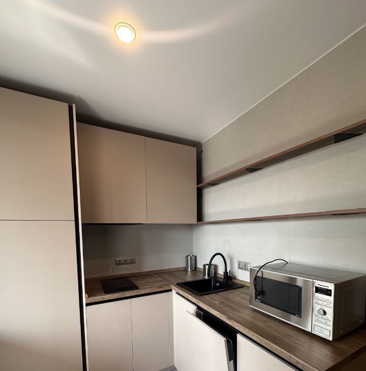 - Светлая, функциональная кухня с полным оснащением, оборудованная качественной техникой. Микроволновая печь, посудомоечная машина, варочная поверхность, холодильник. Есть всё необходимое для жизни