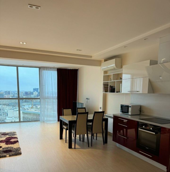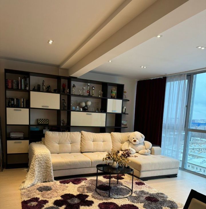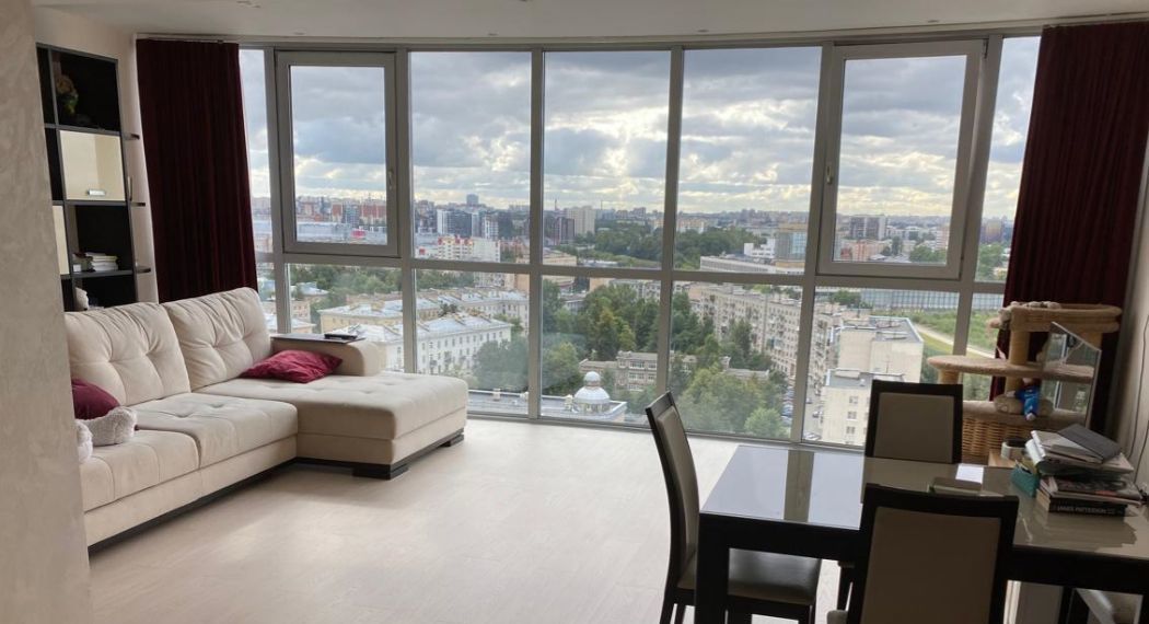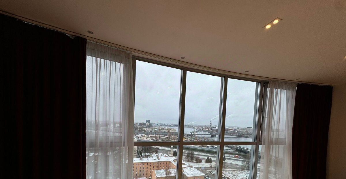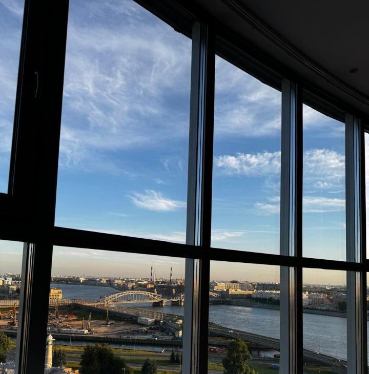 Квартира с панорамным видом: вся стена выполнена из стеклянных окон, наполняющих пространство светом и открывающих захватывающий вид на Неву и Большеохтинский мост. Сдается до сентября 2026 года, с возможным продлением. Площадь квартиры составляет 80 квадратных метров на 17 этаже. Квартира со свободной планировкой: пространство организовано в формате open space, при этом спальня отделена стеклянными раздвижными дверями с видом на город.