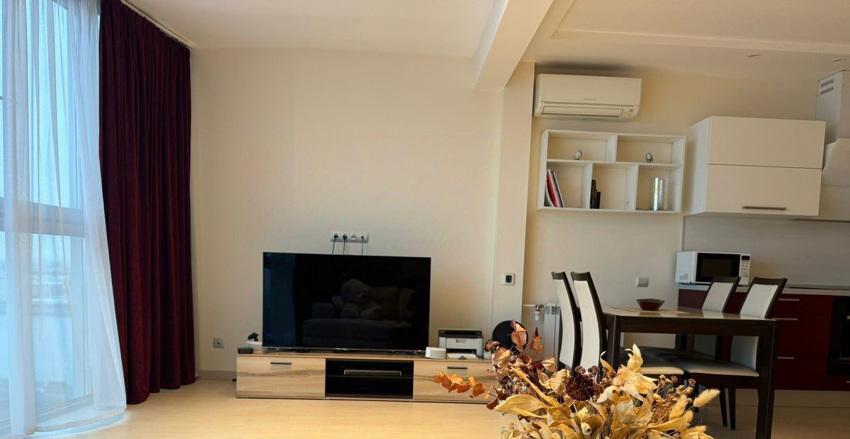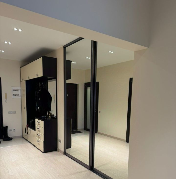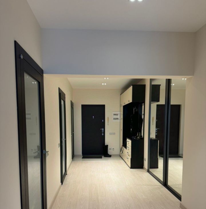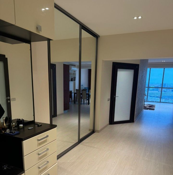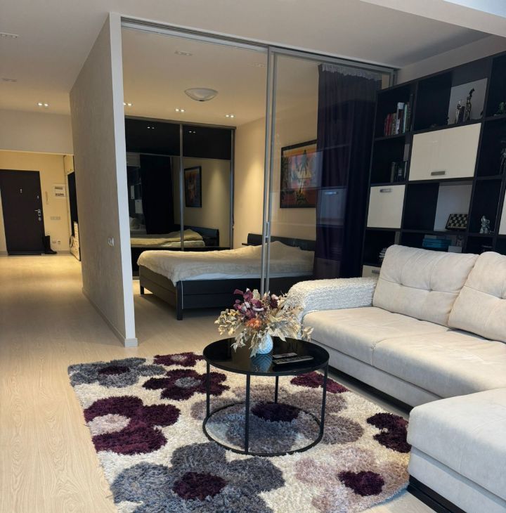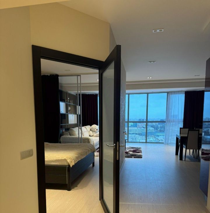 Квартира с панорамным видом: вся стена выполнена из стеклянных окон, наполняющих пространство светом и открывающих захватывающий вид на Неву и Большеохтинский мост. Сдается до сентября 2026 года, с возможным продлением. Площадь квартиры составляет 80 квадратных метров на 17 этаже. Квартира со свободной планировкой: пространство организовано в формате open space, при этом спальня отделена стеклянными раздвижными дверями с видом на город.