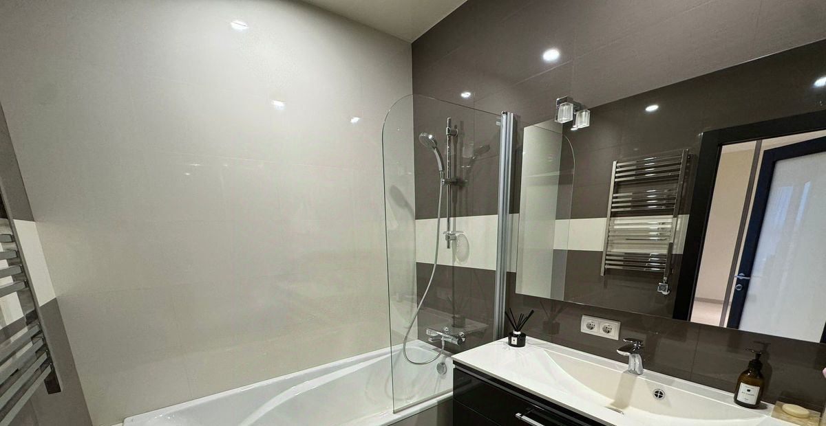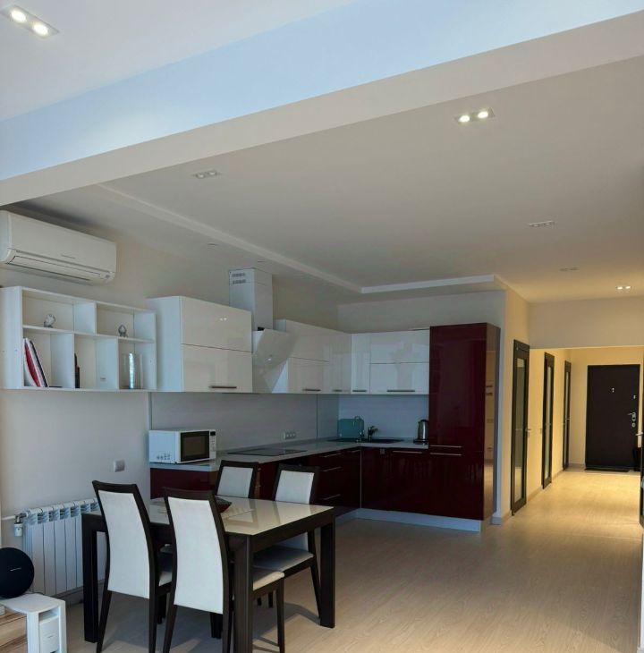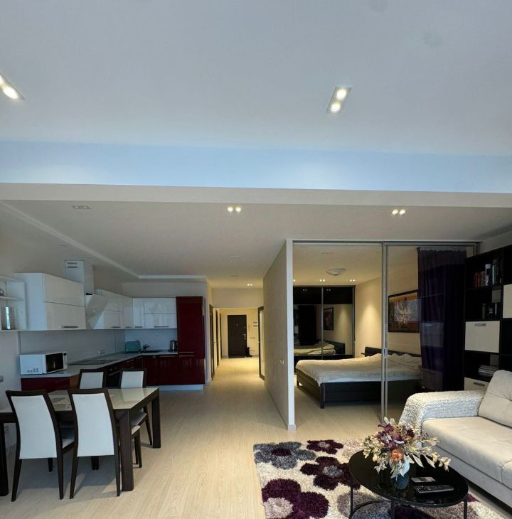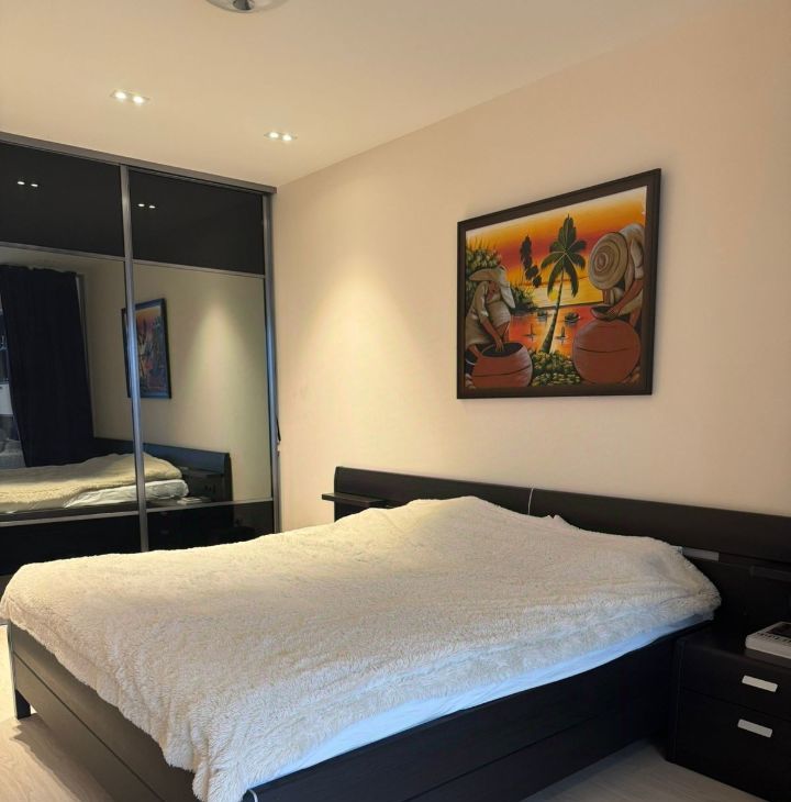 Внутри квартиры современный дизайн и все необходимые удобства. Спальня оформлена с учетом комфорта и уюта. В ванной комнате есть душевая с верхним душем и ванна. На кухне есть вся необходимая техника. Отдельно оборудован хоз. блок. Для вещей два огромных шкафа, в коридоре и в спальне.