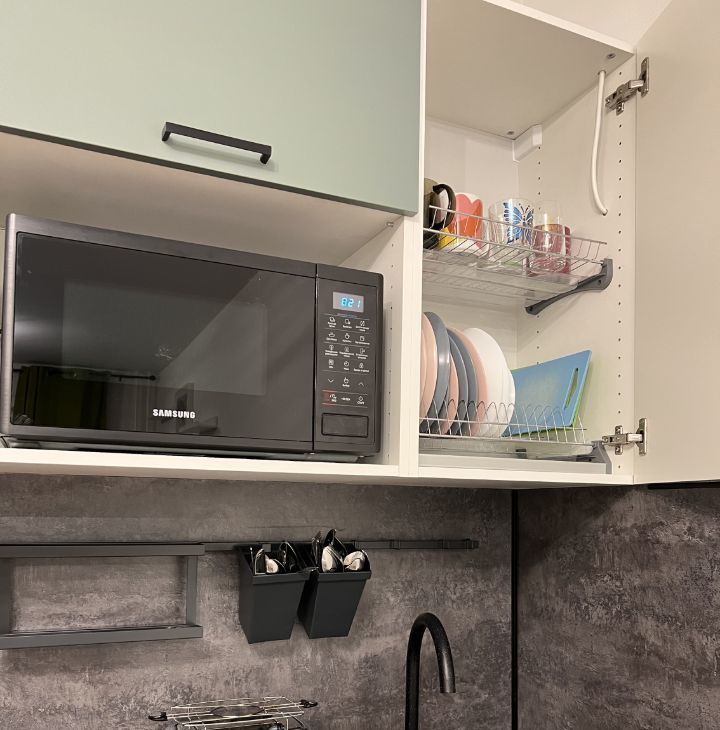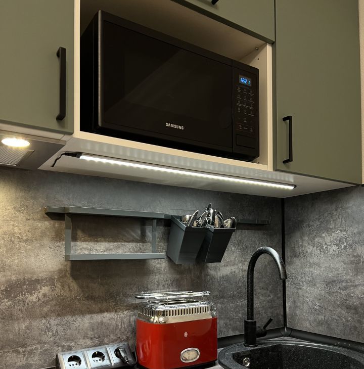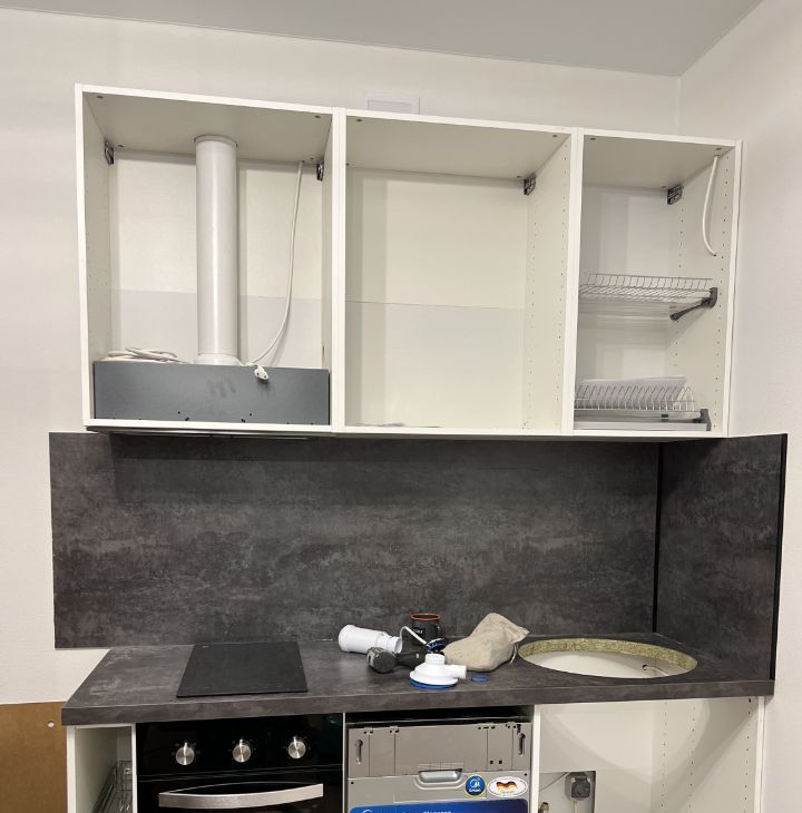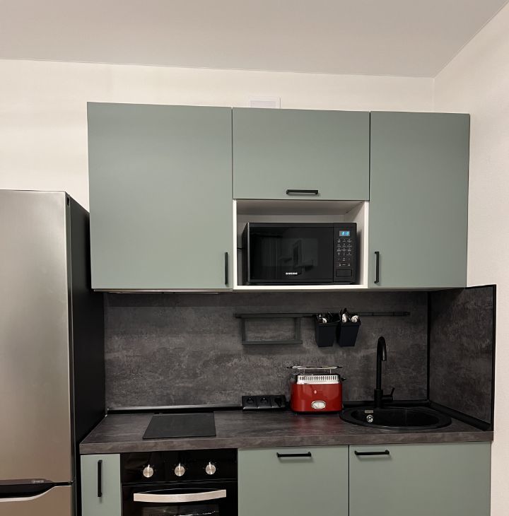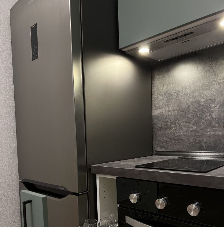 Оборудованная кухня: духовка, плита, вытяжка, посудомойка, холодильник, микроволновка.