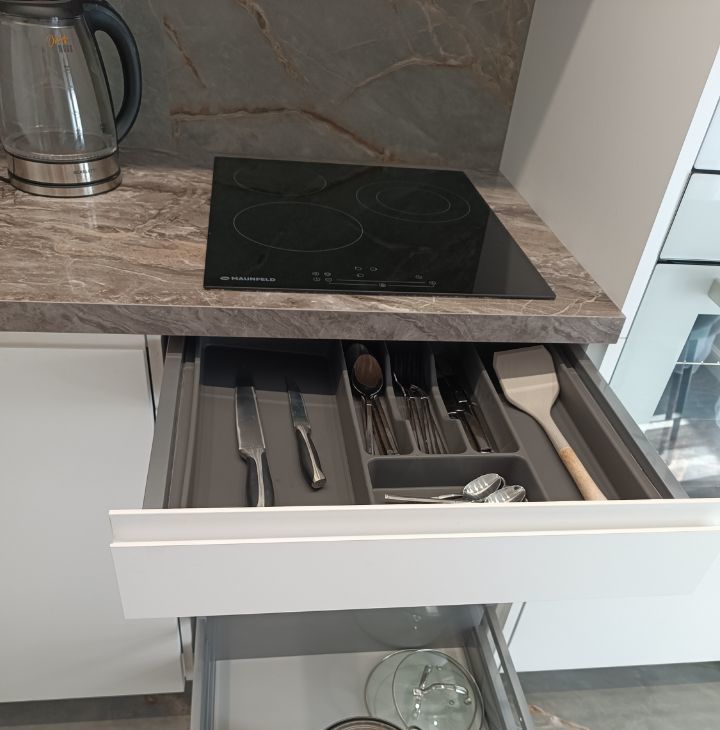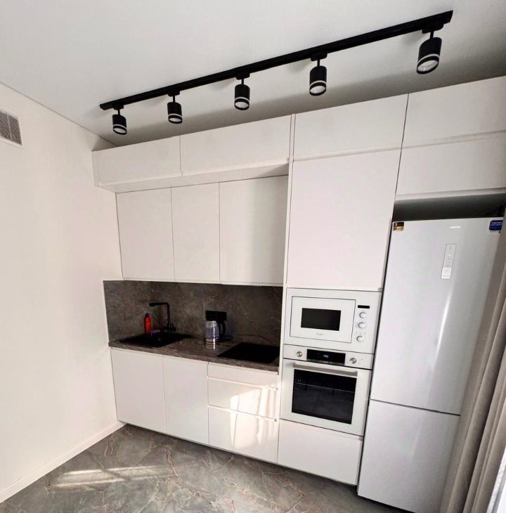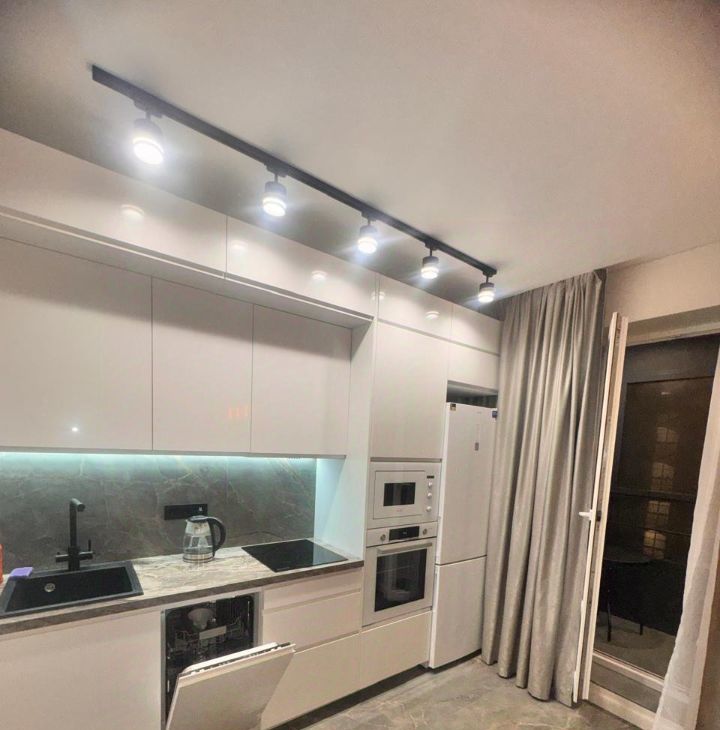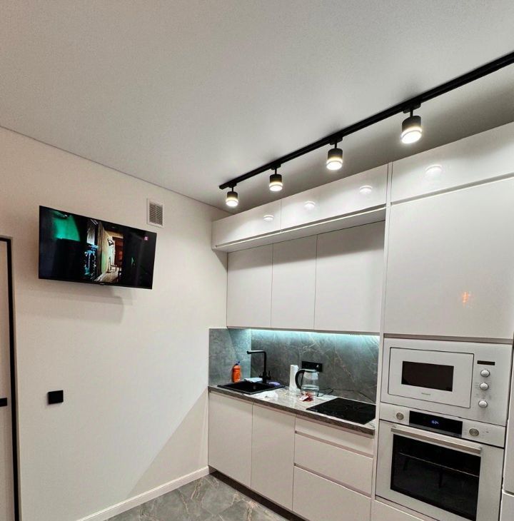 Полностью оборудованная кухня (Холодильник, плита, вытяжка, посудомойка, и духовка, встроенная микроволновка, Фильтр для воды, Телевизор. Электрический чайник, набор посуды .