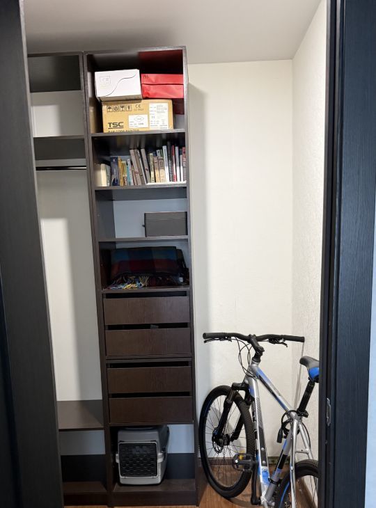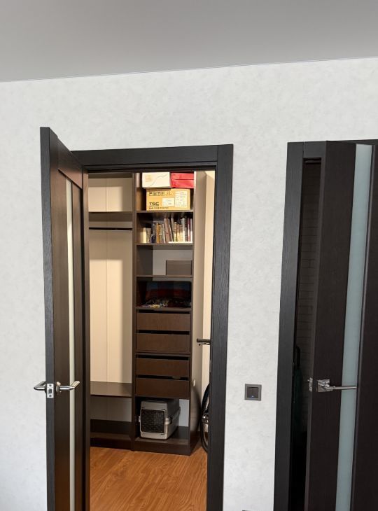 В правой части комнаты находится гардеробная. Стену, отделяющую ее, установили дополнительно. Вместительная гардеробная обеспечивает продуманную зону хранения, для вещей любых габаритов.