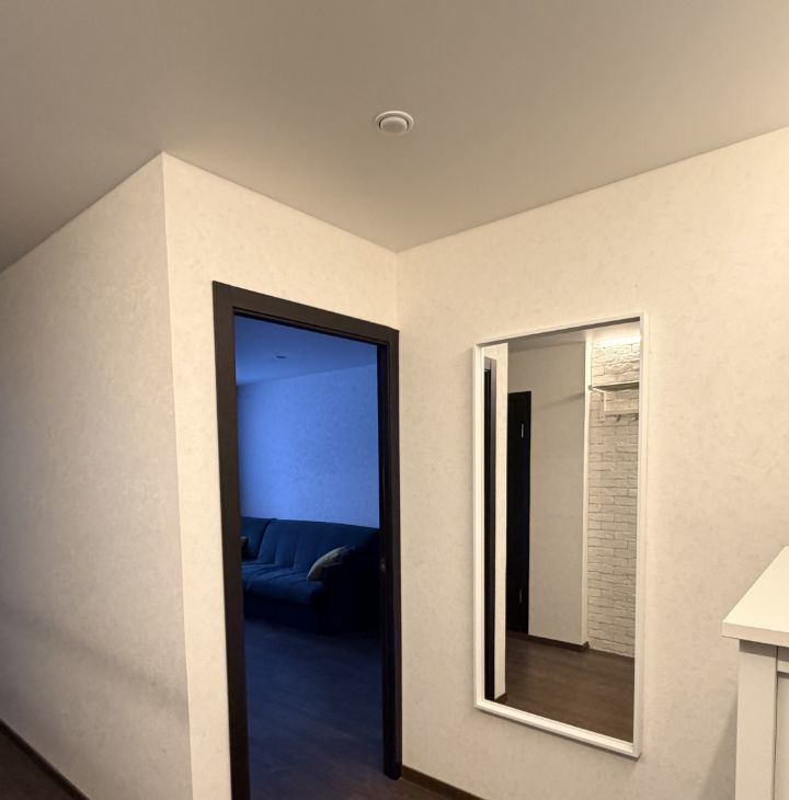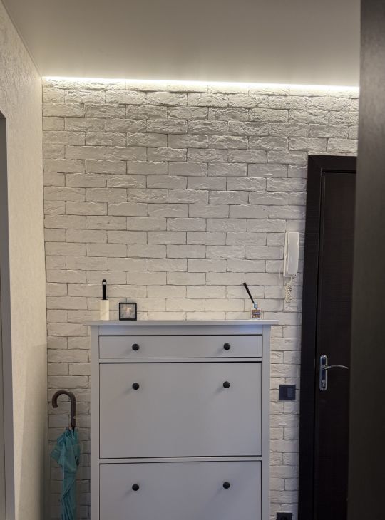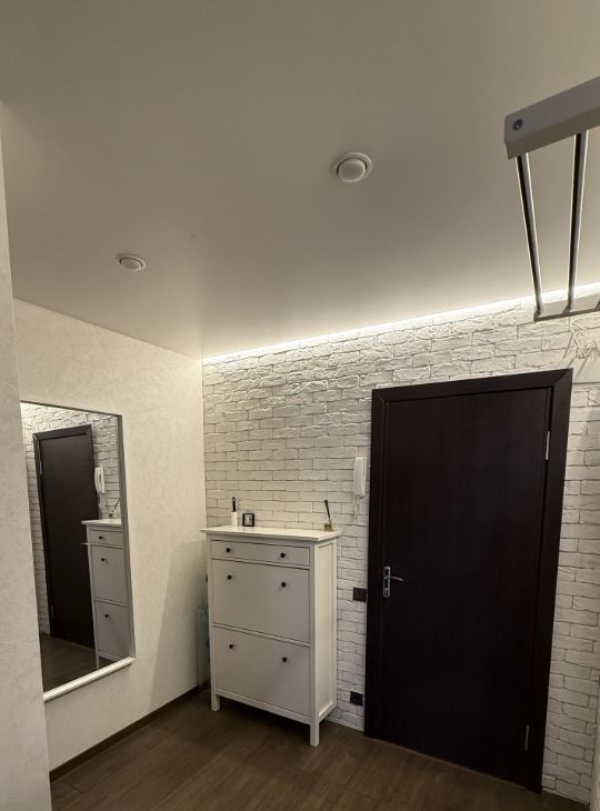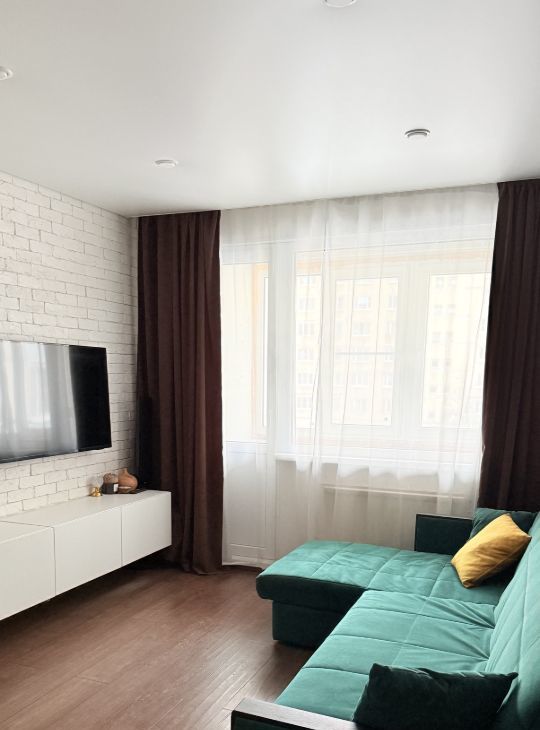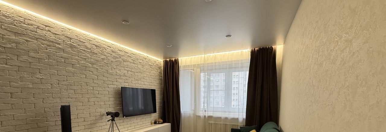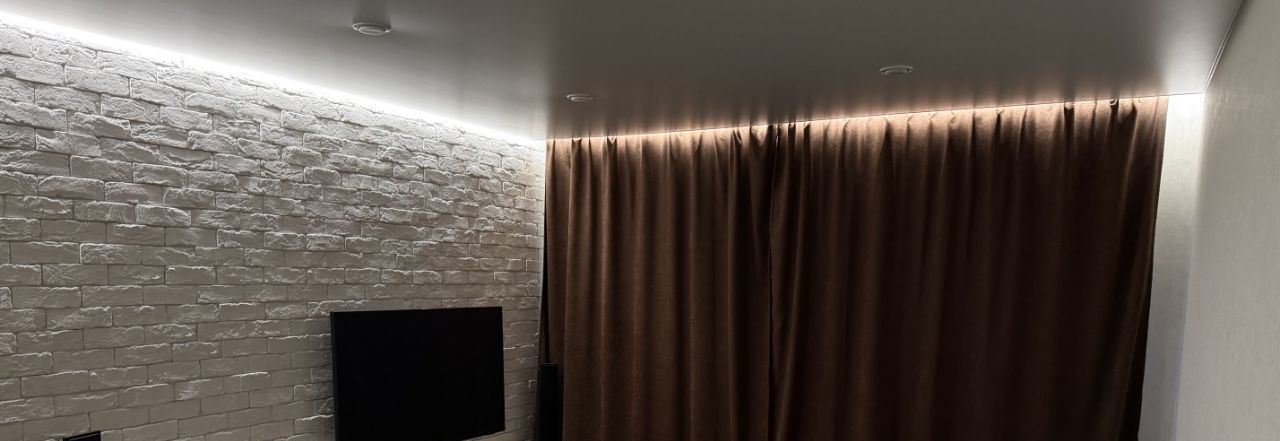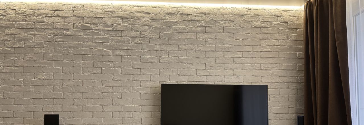 • Уютная комната (18,6м²): Просторная и светлая, она подходит как для отдыха, так и для работы. Акцентная стена, имитирующая белый кирпич, придает интерьеру изюминку. Продуманные сценарии освещения (контурная подсветка, точечные светильники) позволяют создавать разное настроение.