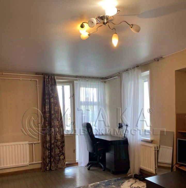 В комнате- раскладной 2-х спальный диван, комод, зеркало, 3-х дверный шкаф-купе, стеллаж, журнальный столик, телевизор, рабочий стол и офисное кресло, лампа настольная, ковер напольный.