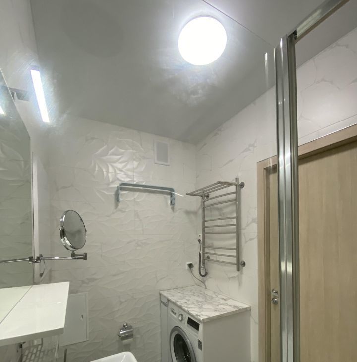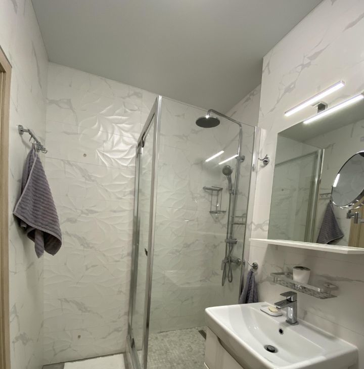 Санузел оснащен душевой кабиной и стиральной машиной.