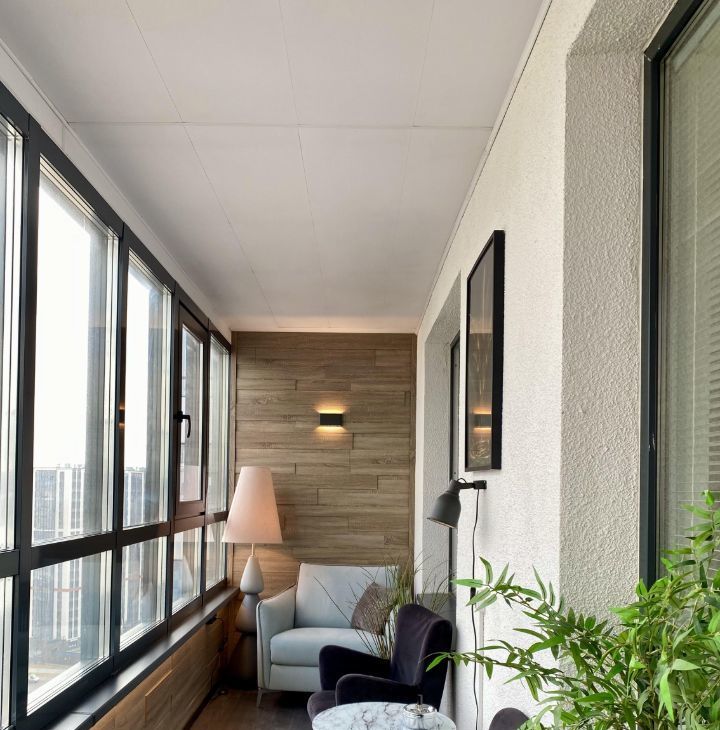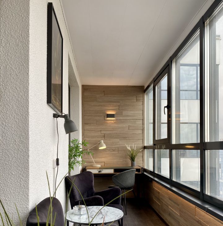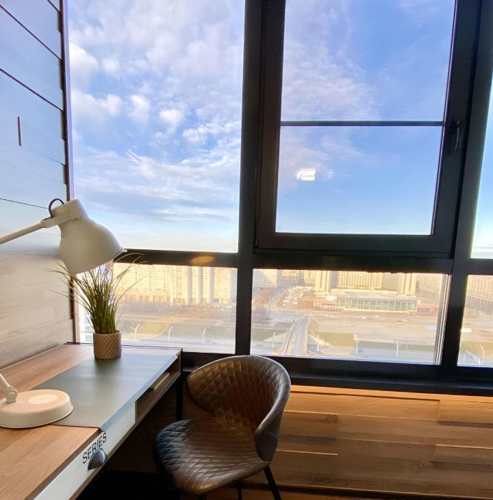 Панорамная лоджия с обогреваемым полом, утеплена и служит дополнительным уютным местом для работы и отдыха.