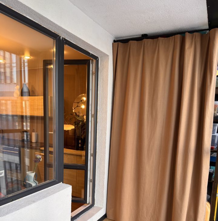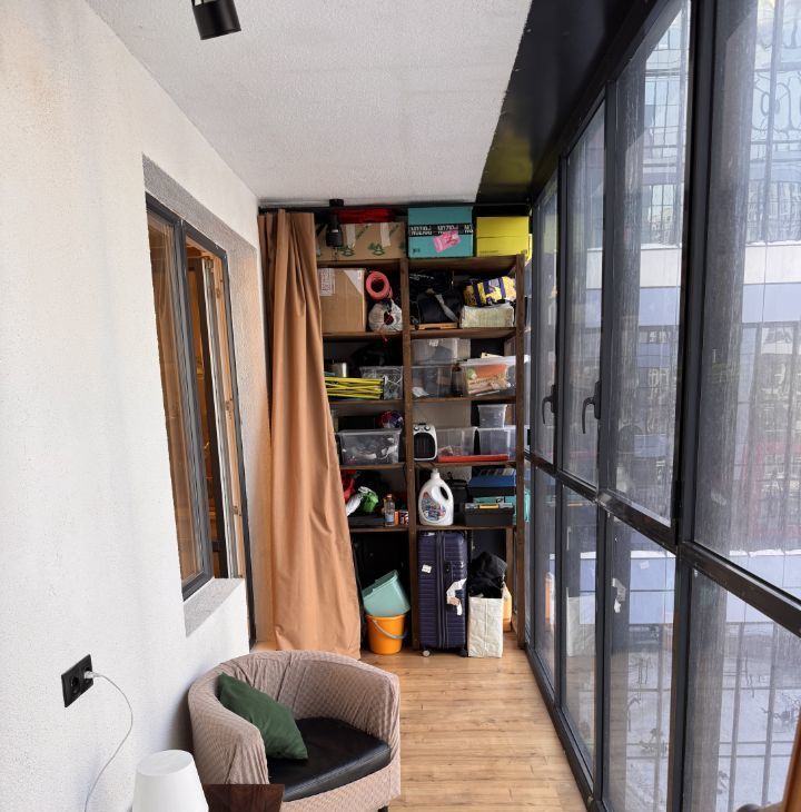 Лоджия застелена ламинатом, оборудована шкафом и дополнительными зонами хранения